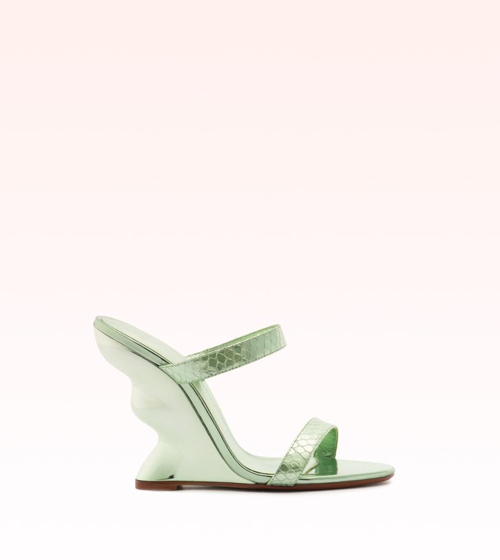 Mavi destaca-se pelo salto cromado de acabamento ondulado, que reforça o aspecto escultural do modelo. O cabedal em embossed metal snake contrasta com a palmilha em baby specchio, criando uma composição monocromática de texturas e brilho. Com salto de 100 mm, é uma proposta ousada, moderna e luxuosa.