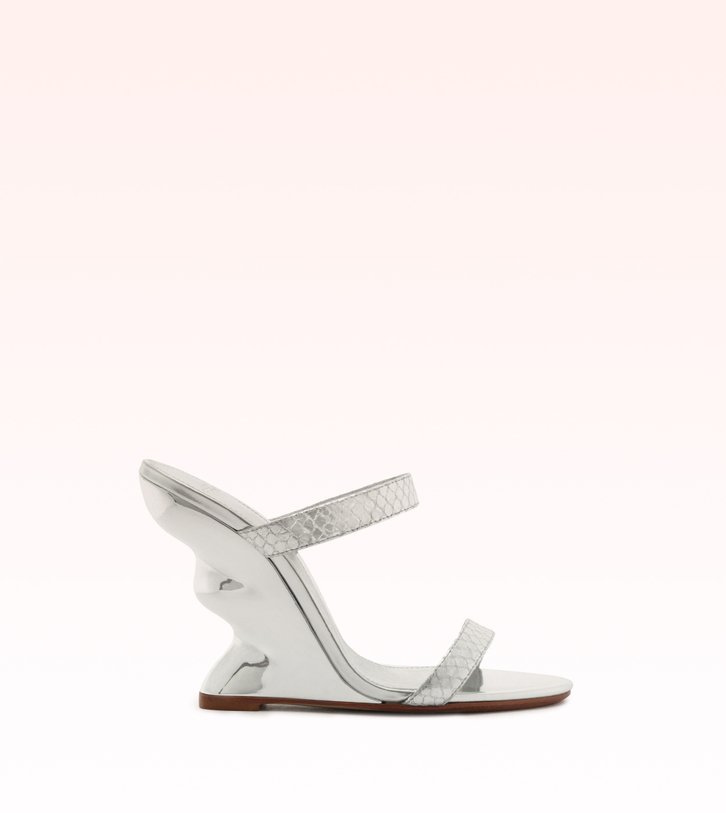 Mavi destaca-se pelo salto cromado de acabamento ondulado, que reforça o aspecto escultural do modelo. O cabedal em embossed metal snake contrasta com a palmilha em baby specchio, criando uma composição monocromática de texturas e brilho. Com salto de 100 mm, é uma proposta ousada, moderna e luxuosa.