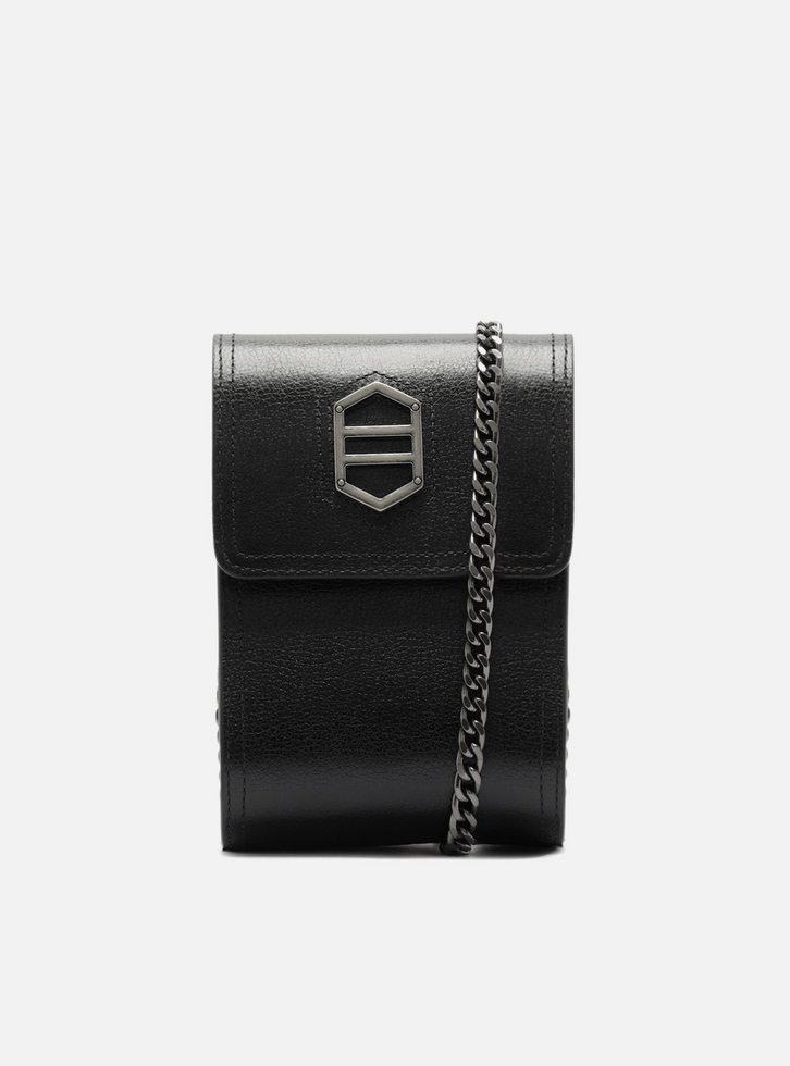 Mini bolsa tiracolo de couro preta. O acessório tem formato retangular, laterais arredondadas e alça tiracolo em corrente metálica fina. Traz bolso frontal para celular com fecho em tampo e aplicação de metal hexagonal.