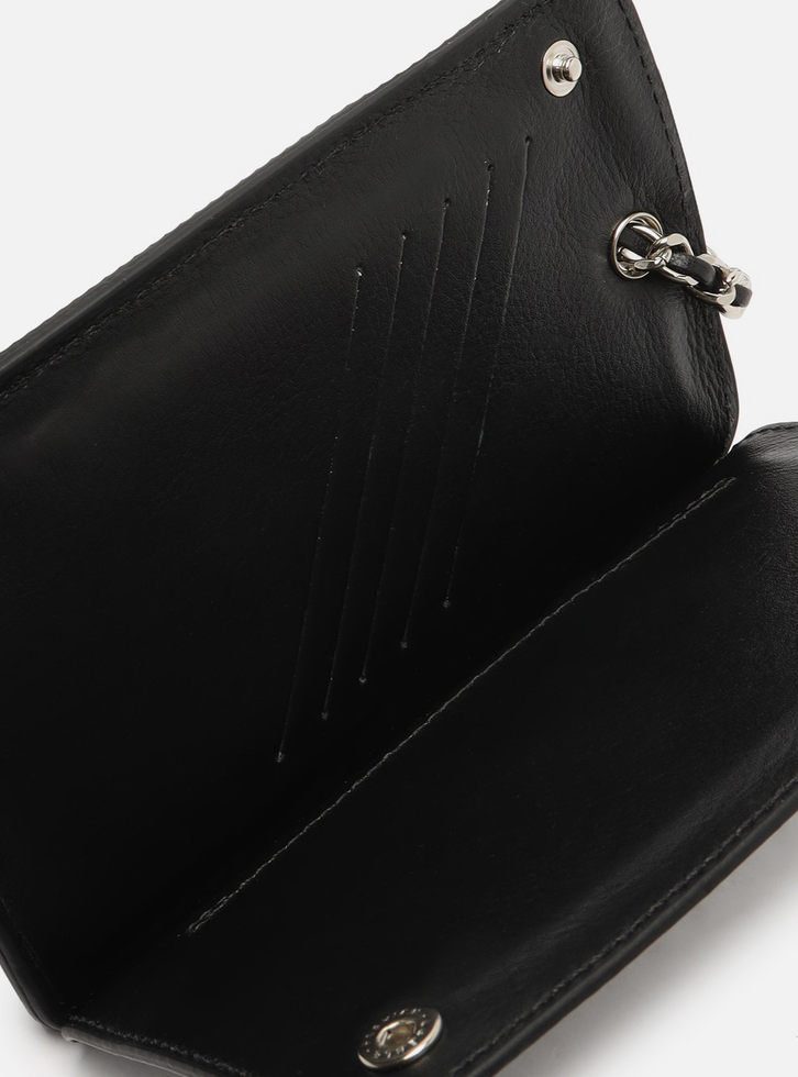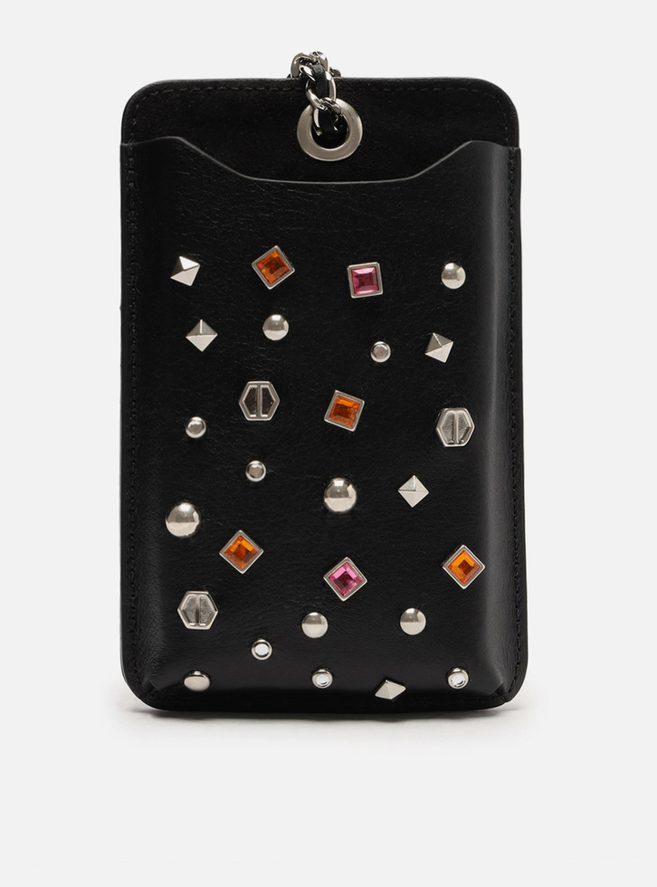 Mini bolsa tiracolo de couro preta. O modelo tem formato retangular, laterais arredondadas e alça tiracolo em corrente com detalhes de couro e ombreira presa por ilhós. Traz acabamento liso com aplicação de tachas e pedrarias coloridas, além de bolso frontal para celular ou smartphone. Possui porta-cartões interno e fecho em botões de pressão.