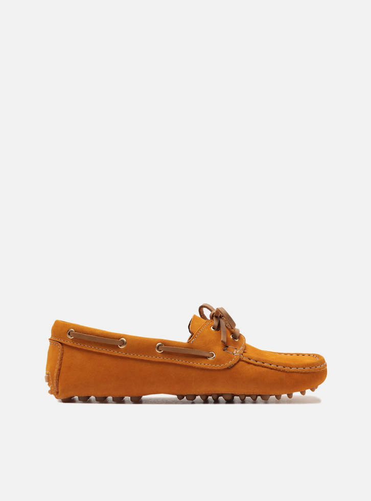 Mocassim feminino amarelo mostarda em camurça. O sapato tem salto rasteiro e formato arredondado na ponta, além de sola emborrachada com travas. Fechado, traz recorte lateral na gáspea e aplicação de tira transpassada no contorno superior que fecha em laço sobre o cabedal. Possui costura em pesponto no contorno da biqueira e sobreposição no calcanhar. Exibe toda a parte superior do pé.