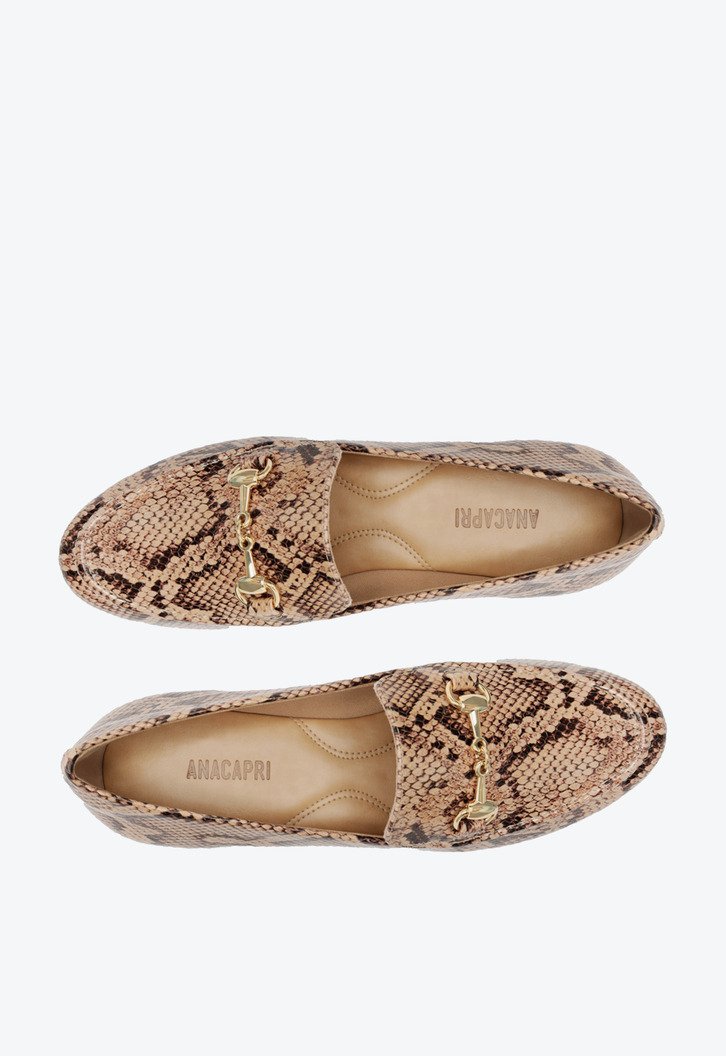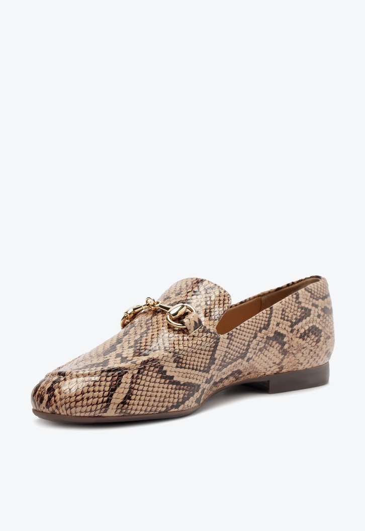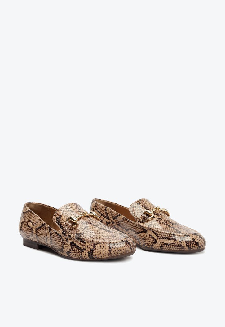 Mocassim Bridão Essencial Snake Animal Print. Possui bico arredondado e aplicação de bridão metálico na gáspea. Salto baixo emborrachado. Fechado, cobre todo o pé.