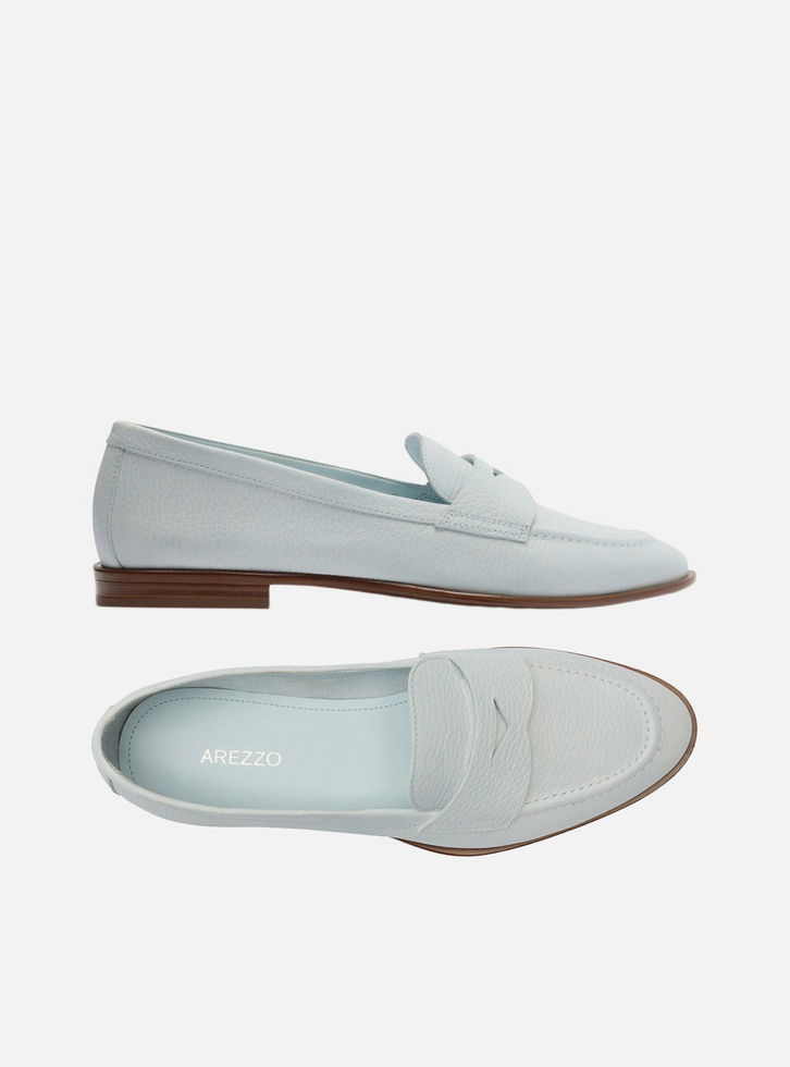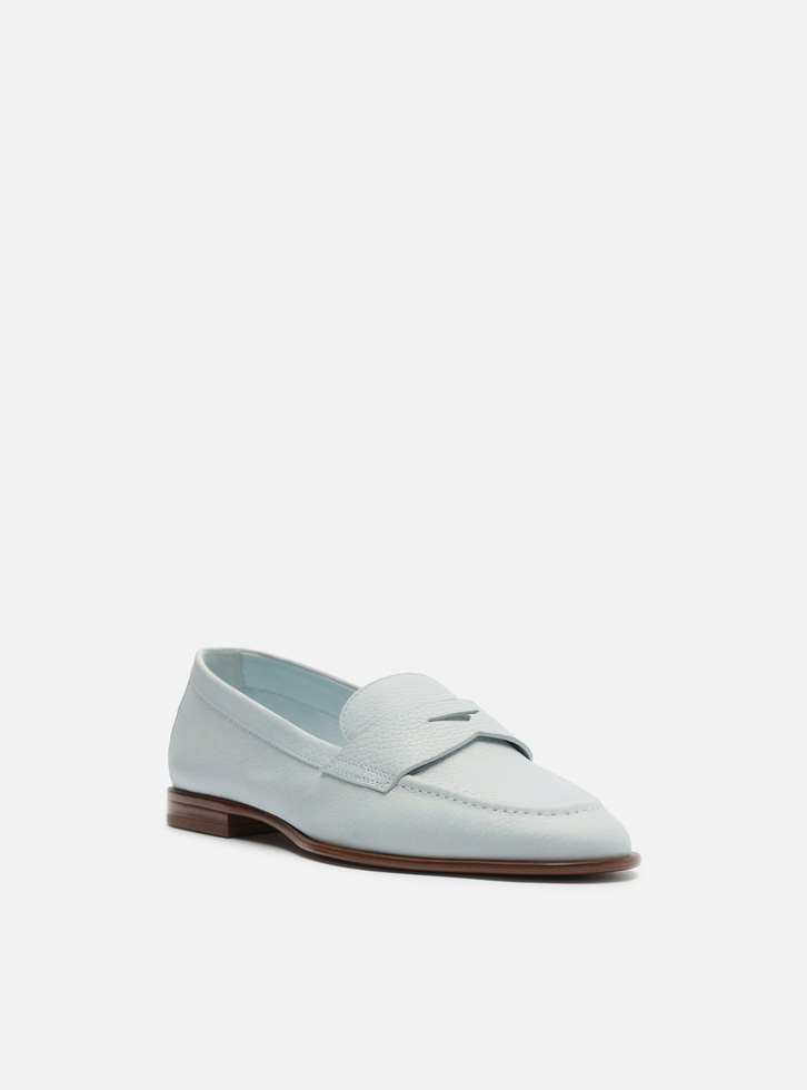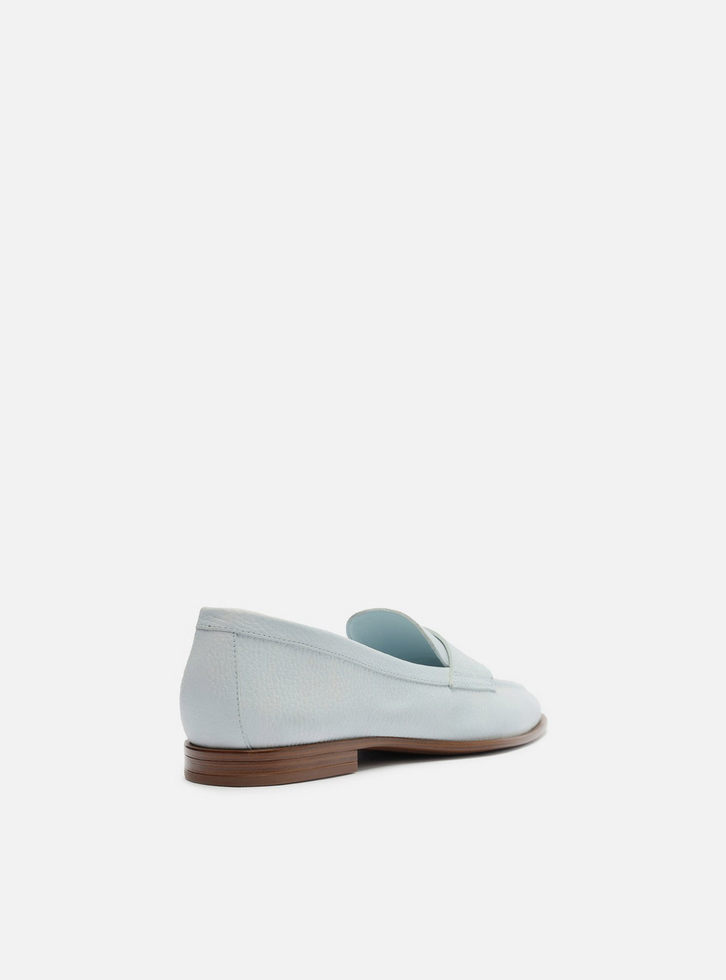 Mocassim feminino azul-claro de couro. O sapato tem salto rasteiro, base marrom e formato arredondado na ponta. Fechado, traz recorte lateral na gáspea e aplicação de tira de couro vazada sobre o cabedal. Possui costura marcada no contorno da parte frontal do cabedal.