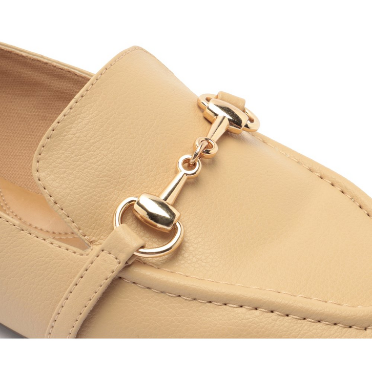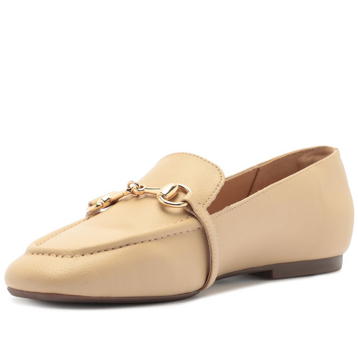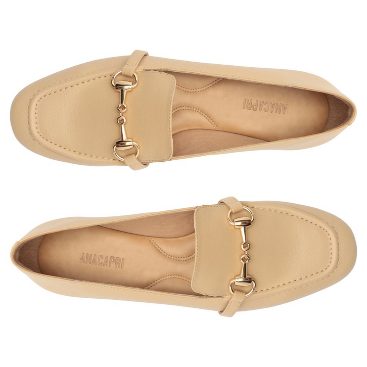 Mocassim Anacapri com bridão, na cor nude. O modelo possui solado rasteiro e emborrachado, com leve saltinho traseiro. Traz recorte lateral na gáspea e aplicação de bridão metálico com design imponente de encaixe sobre a gáspea. Com biqueira quadrada, traz palmilha confortável com assinatura Anacapri. Fechado, o modelo exibe o peito do pé.