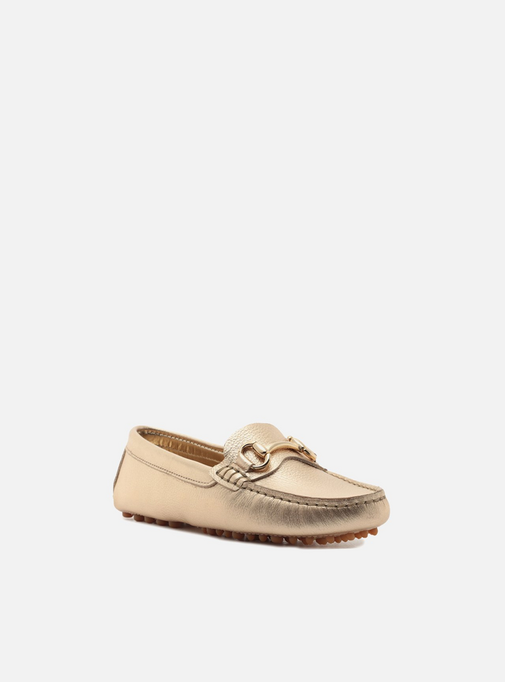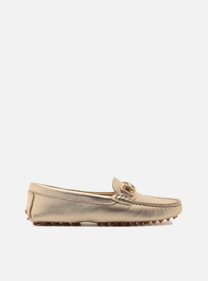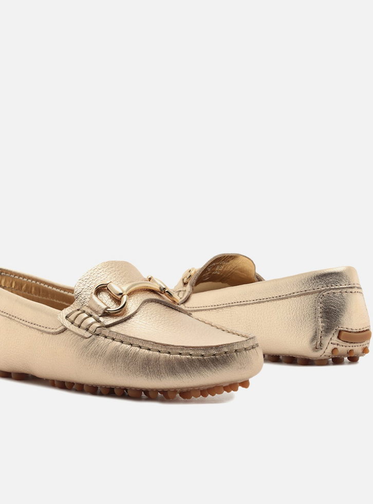 Mocassim feminino. O sapato tem salto rasteiro e formato arredondado na ponta. Fechado, e aplicação de bridão metálico dourado. Com palmilha e inscrição do nome da marca, exibe toda a parte superior do pé.
