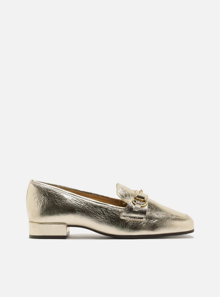 Mocassim feminino dourado de couro. O sapato tem salto baixo bloco e formato arredondado na ponta. Fechado, traz recorte lateral na gáspea e aplicação de tira com bridão metálico dourado sobre o cabedal. Com palmilha na cor do sapato e inscrição do nome da marca.