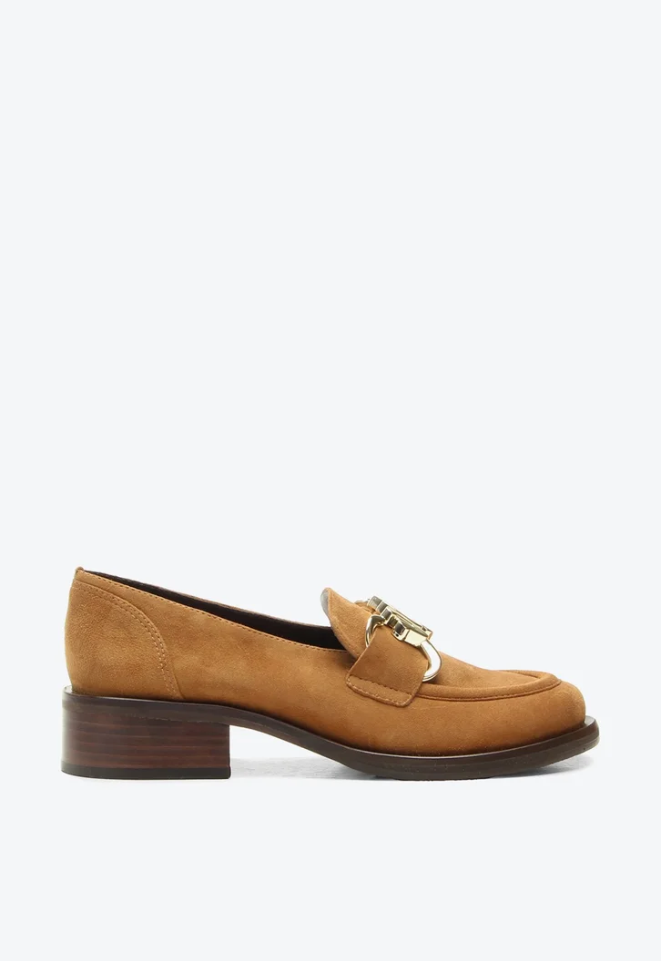 Mocassim de salto baixo em camurça caramelo. Um verdadeiro must-have para a estação, ele traz um adorno frontal com a assinatura VCZ, conferindo um charme autêntico e sofisticado. Ideal para quem busca praticidade e elegância no visual, combina perfeitamente com calças flare, blusas de lã e trench coats.