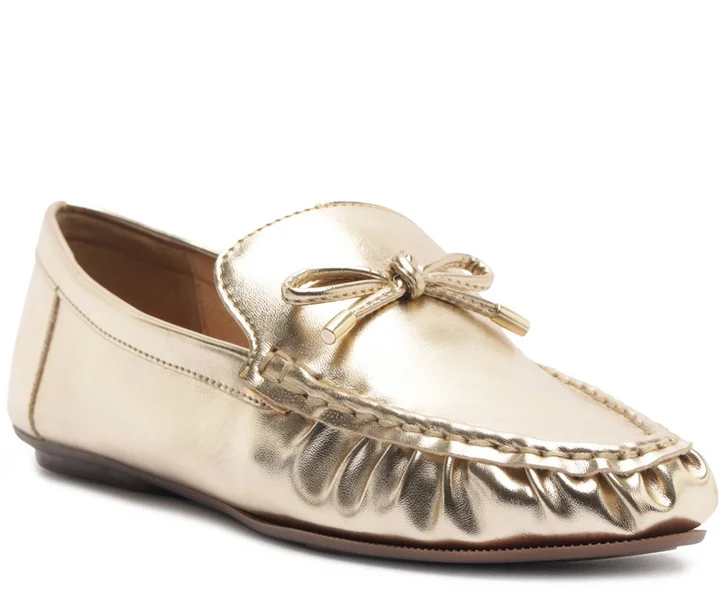 Mocassim com detalhe em laço, na cor dourada. O modelo tem salto rasteiro flat, base emborrachada com leve saltinho traseiro e biqueira arredondada. Fechado, traz recorte lateral na gáspea e aplicação de lacinho delicado sobre o cabedal. Apresenta costura externa nas bordas da biqueira, calcanhar e laterais da gáspea. Possui parte frontal com pregas e traz palmilha bege confortável, com assinatura Anacapri.