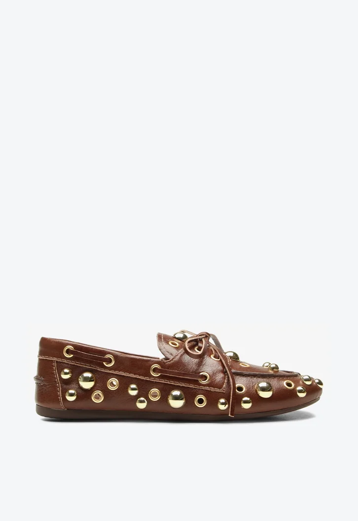 Mocassim Harper em couro marrom com aplicações metalizadas. Com design fechado, se destaca pelas aplicações em meias esferas e ilhós, além do laço frontal, que adicionam delicadeza e personalidade ao visual. Possui essência boho em cada detalhe, fazendo dele único e autêntico. Ideal para quem busca um toque rústico chic nas composições do dia a dia.