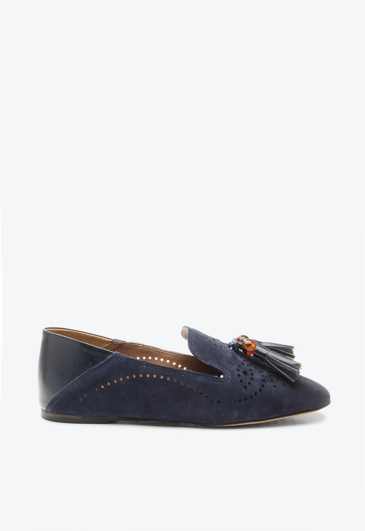 Mocassim Johana Azul em camurça traz atitude boho com acabamento artesanal. O cabedal perfurado cria um visual leve e sofisticado, enquanto o tassel frontal com miçangas adiciona movimento e personalidade. Com bico redondo e perfil rasteiro, oferece conforto para acompanhar a rotina com estilo. Um modelo autêntico e versátil, ideal para quem busca elegância descomplicada e presença marcante.