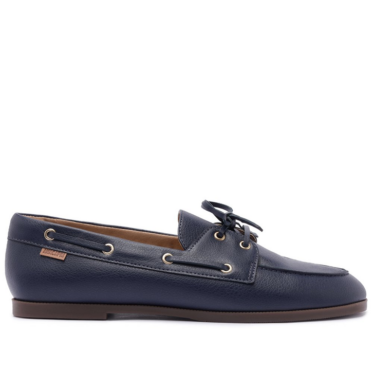 Mocassim despojado, na cor azul. O modelo tem solado rasteiro emborrachado com leve saltinho traseiro e biqueira arredondada. De material similar ao couro, em napa destroyed, o modelo apresenta shape mais largo e detalhe de amarração na gáspea. Traz contorno lateral delicado em tirinha no mesmo tom do sapato, que perpassa por ilhós metálicos, com palmilha comfy e assinatura Anacapri. Com aplicação de tag marrom Anacapri na lateral.