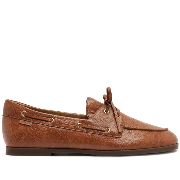 Mocassim em couro, com detalhe em amarração, na cor marrom. O modelo tem solado rasteiro emborrachado com leve saltinho traseiro e biqueira arredondada. De material similar ao couro, em napa boho, com efeito texturizado, o modelo apresenta shape mais largo e detalhe de amarração na gáspea. Traz contorno lateral delicado em tirinha no mesmo tom do sapato, que perpassa por ilhós metálicos, forrada na parte interna e palmilha comfy, com assinatura Anacapri. Com aplicação de tag marrom Anacapri na lateral.