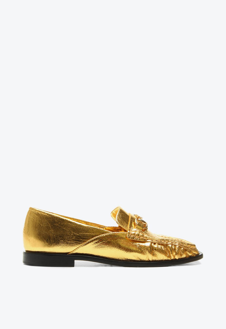 Mocassim Lise em couro dourado. Com visual marcante e toque fashion, o modelo surge em couro dourado com aplicação exclusiva Vicenza. O brilho metalizado reforça a identidade ousada e moderna da coleção, que aposta em materiais expressivos e adornos como protagonistas. Ideal para compor looks criativos e autênticos!