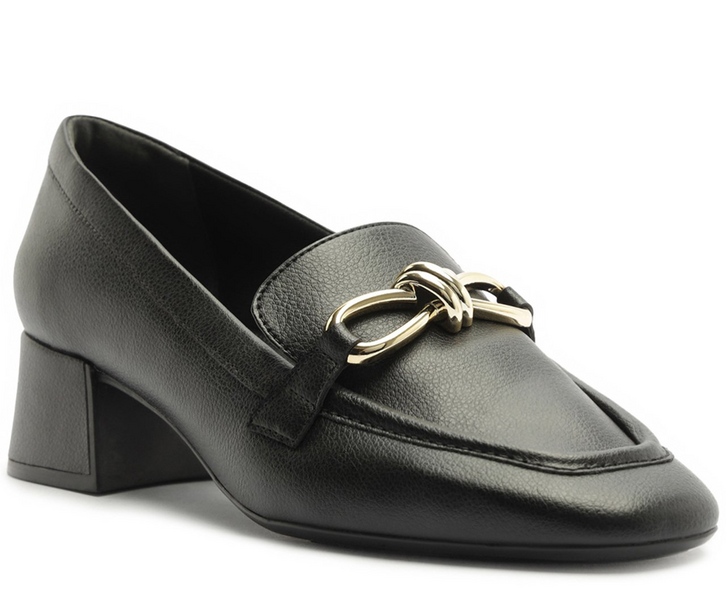 Mocassim de salto bloco, com detalhe em adorno metálico, na cor preta. O modelo tem salto em bloco baixo e biqueira moderna quadrada. Fechado, traz recorte lateral imponente e com detalhe para aplicação de adorno metálico central - com efeito torcido - na gáspea, no lugar do tradicional bridão. Possui costura em pespontos no contorno da biqueira, com detalhe na parte frontal com pregas. Com palmilha confortável e assinatura Anacapri, o mocassim exibe o peito do pé.
