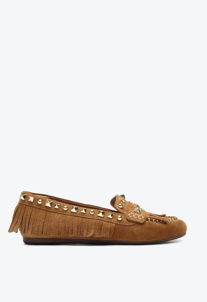 O mocassim Mansel em suede caramelo é um verdadeiro ícone de estilo com toque boho e moderno ao mesmo tempo, combinando o acabamento macio e sofisticado do material com aplicações de studs dourados que trazem personalidade e atitude ao visual, enquanto as franjas laterais e o detalhe artesanal no cabedal reforçam a identidade contemporânea da peça, que transita perfeitamente entre o casual chic e produções mais despojadas com elegância.