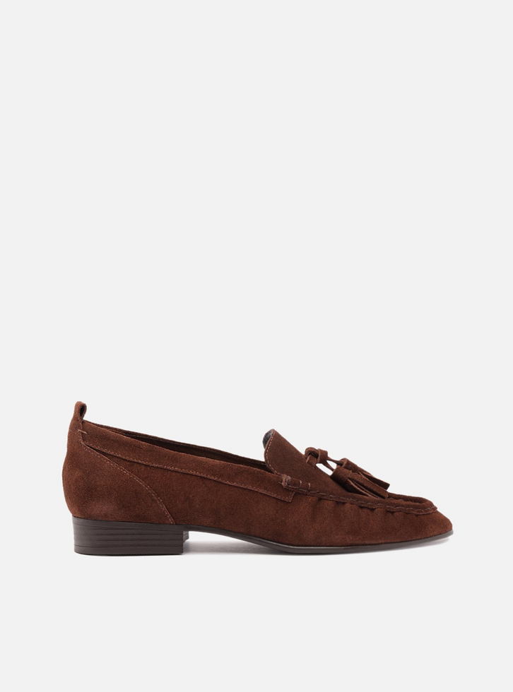 Mocassim feminino marrom acamurçado. O sapato tem salto mínimo bloco e formato arredondado na ponta. Fechado, traz recorte lateral na gáspea e aplicação de par de barbicachos sobre o cabedal. Possui costura marcada no contorno da parte frontal e pregas. Com tira no calcanhar, exibe toda a parte superior do pé.