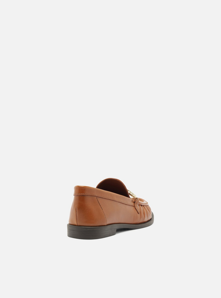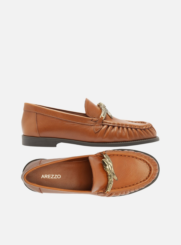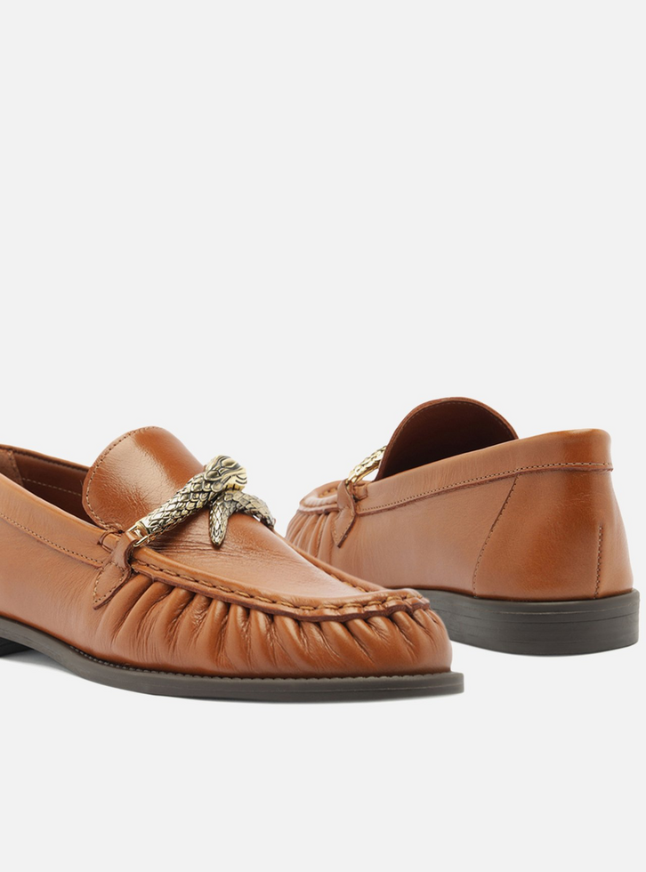 Mocassim feminino marrom de couro. O sapato tem salto mínimo bloco e formato arredondado na ponta. Fechado, traz recorte lateral na gáspea e aplicação de metal em forma de cobra sobre o cabedal. Possui costura marcada no contorno da parte frontal e franzidos.