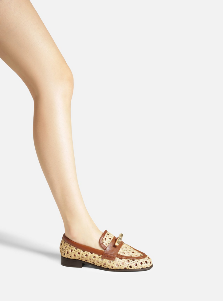 Mocassim feminino em couro marrom e palha natural sextavada. O sapato tem salto mínimo bloco e formato arredondado na ponta. Fechado, traz cabedal em palhinha sextavada e vazada, com tira em couro sobreposta e aplicação de metal dourado em formato que remete a um bambu. Com palmilha marrom de couro e inscrição do nome da marca.