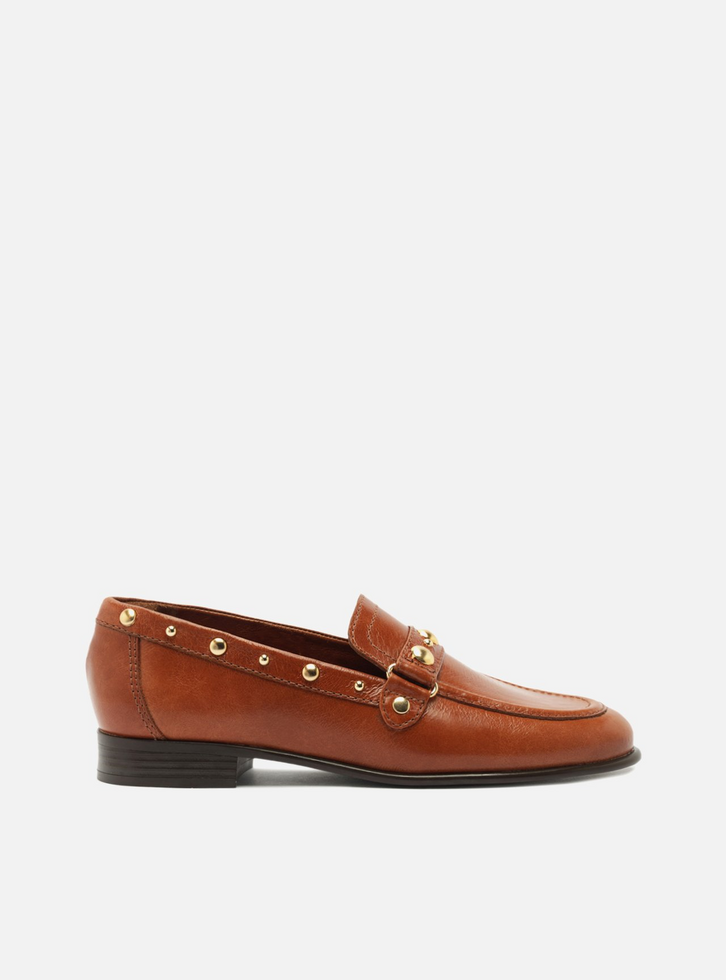 Mocassim feminino marrom de couro. O sapato tem salto mínimo bloco e formato arredondado na ponta. Fechado, traz recorte lateral na gáspea e aplicação de tira fina com tachas metálicas douradas e rebites sobre o cabedal. Possui costura marcada na parte frontal e tachas no contorno superior.