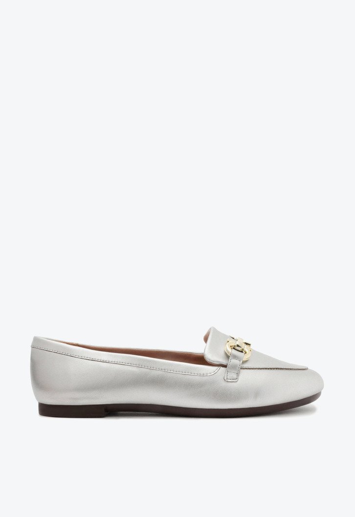 Mocassim Bridão Classy Minimal Prata. O modelo tem salto rasteiro flat, base emborrachada com leve saltinho e biqueira arredondada. Fechado, traz recorte lateral na gáspea e aplicação do bridão metálico tradicional sobre o cabedal. Possui costura em pespontos no contorno da biqueira e nas laterais. Com palmilha bege acolchoada ultra comfy e assinatura Anacapri em relevo, o mocassim exibe o peito do pé.