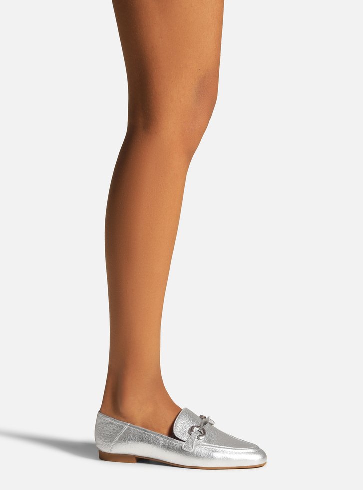 Mocassim feminino prata de couro. O modelo tem salto rasteiro e bico redondo. Fechado, traz recorte lateral na gáspea e aplicação de bridão metálico dourado, preso por tiras, sobre o cabedal. Possui costura bombada no contorno da biqueira. Com palmilha bege e inscrição do nome da marca, exibe todo o peito do pé.