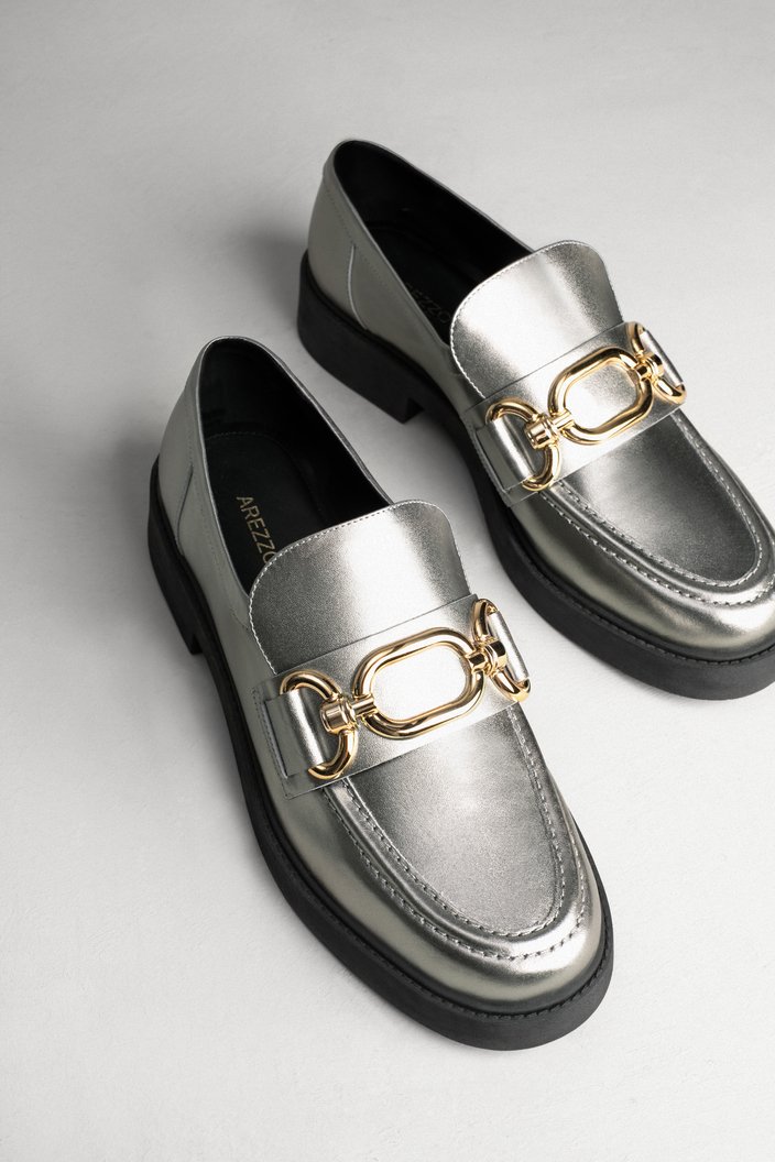 Mocassim feminino prata de couro. O sapato tem salto baixo bloco, solado emborrachado preto e formato arredondado na ponta. Fechado, traz recorte lateral na gáspea, costura destacada na biqueira e aplicação de tira larga e bridão metálico geométrico sobre o cabedal.