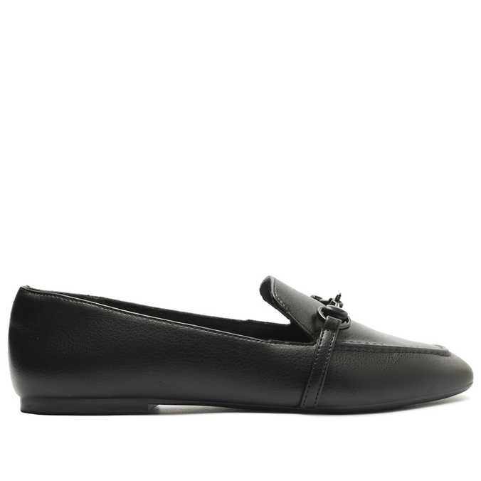 Mocassim ANACAPRI preto em material similiar ao couro. Posui bico levemente quadrado e aplicação de bridão na gáspea na mesma cor do modelo. Salto baixo emborrachado. Fechado, cobre todo o pé.