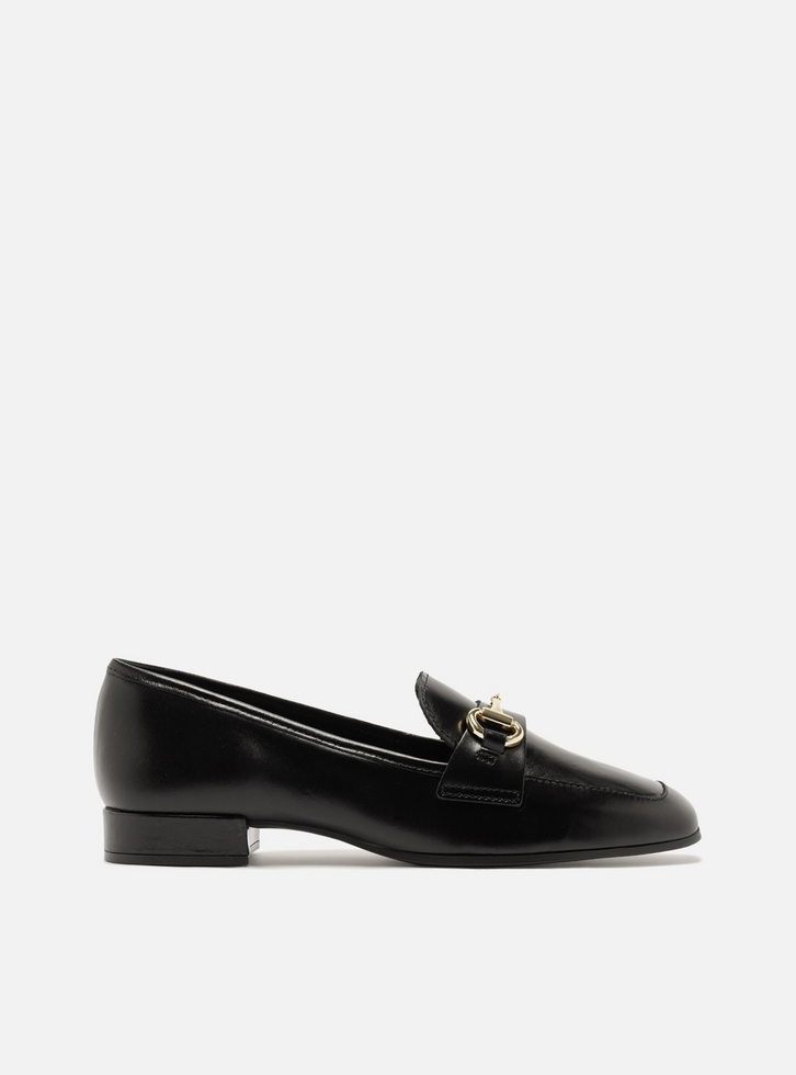 Mocassim feminino preto de couro. O sapato tem salto baixo bloco e formato arredondado na ponta. Fechado, traz recorte lateral na gáspea e aplicação de tira com bridão metálico dourado sobre o cabedal. Com palmilha na cor do sapato e inscrição do nome da marca.