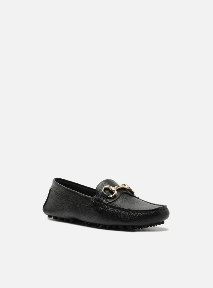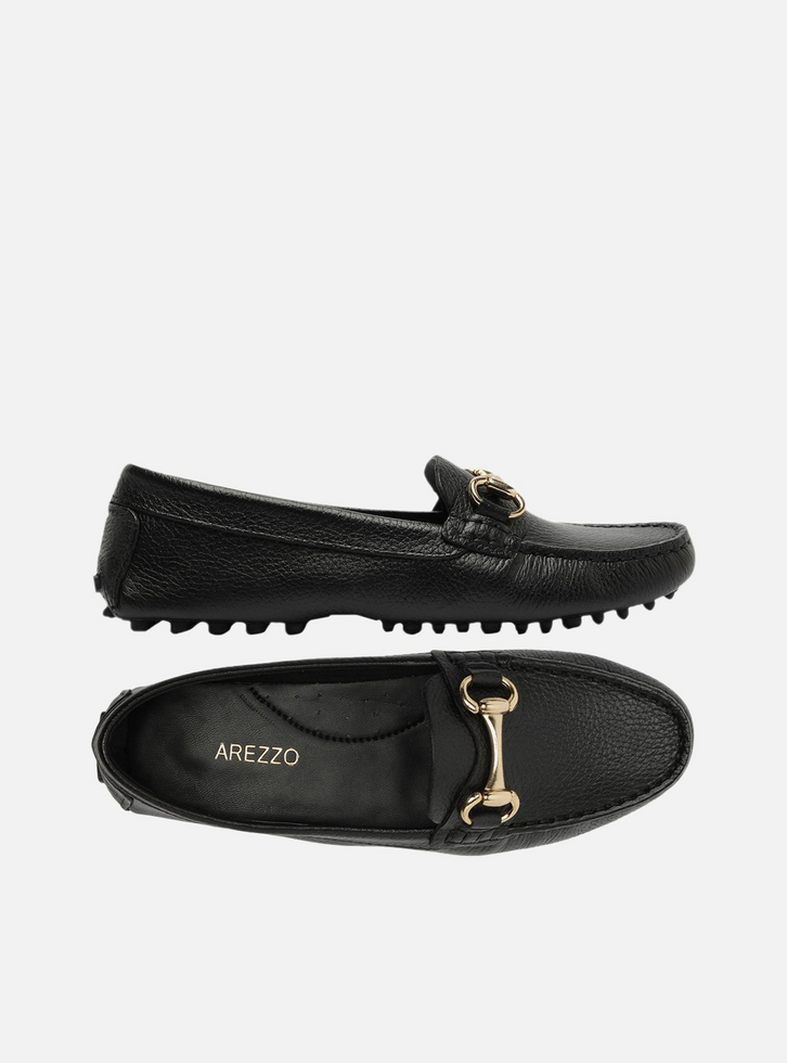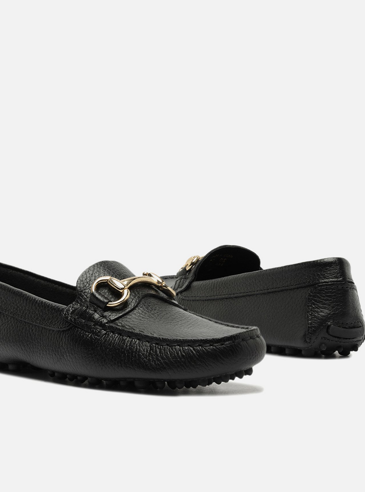 Mocassim feminino preto de couro. O sapato tem salto rasteiro e formato arredondado na ponta, além de sola emborrachada com travas. Fechado, traz recorte lateral na gáspea e aplicação de bridão metálico sobre o cabedal. Possui costura em pesponto no contorno da biqueira e sobreposição no calcanhar. Exibe toda a parte superior do pé.
