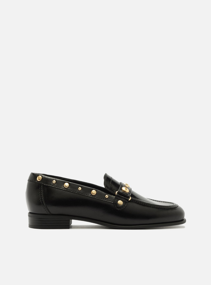 Mocassim feminino preto de couro. O sapato tem salto mínimo bloco e formato arredondado na ponta. Fechado, traz recorte lateral na gáspea e aplicação de tira fina com tachas metálicas douradas e rebites sobre o cabedal. Possui costura marcada na parte frontal e tachas no contorno superior.