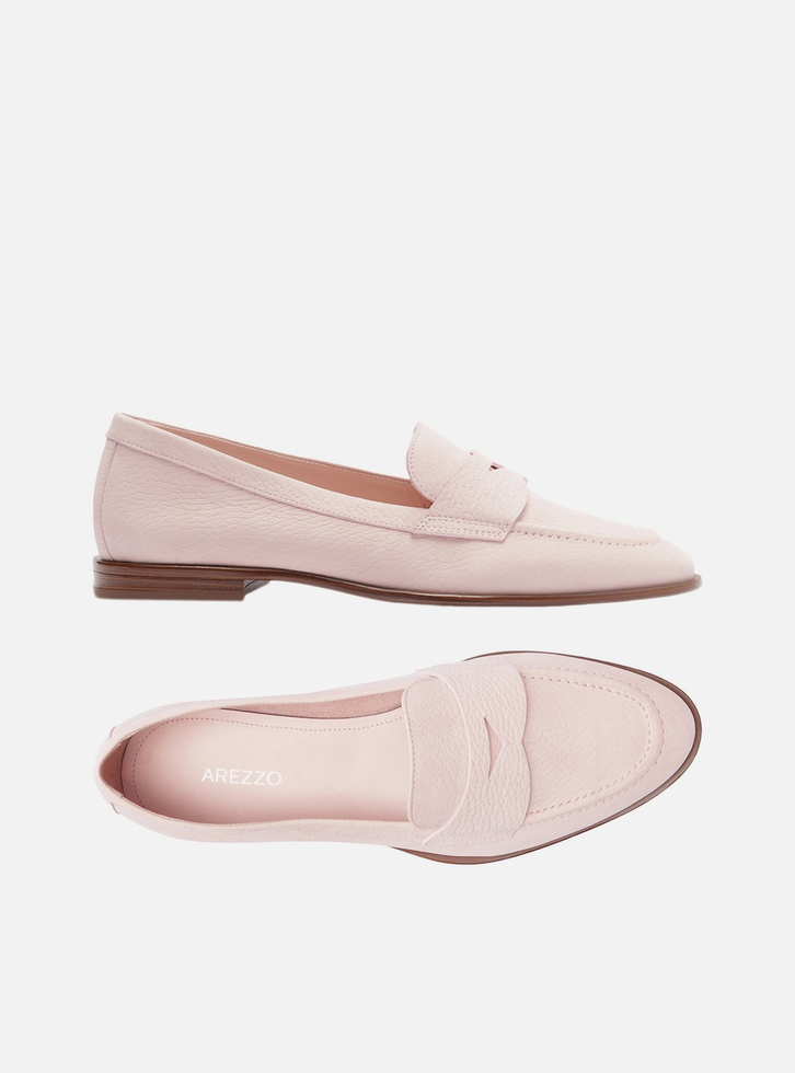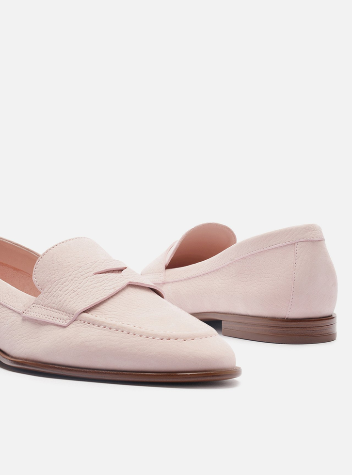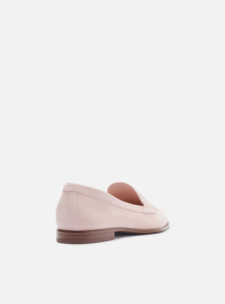 Mocassim feminino rosa-claro de couro. O sapato tem salto rasteiro, base marrom e formato arredondado na ponta. Fechado, traz recorte lateral na gáspea e aplicação de tira de couro vazada sobre o cabedal. Possui costura marcada no contorno da parte frontal do cabedal.