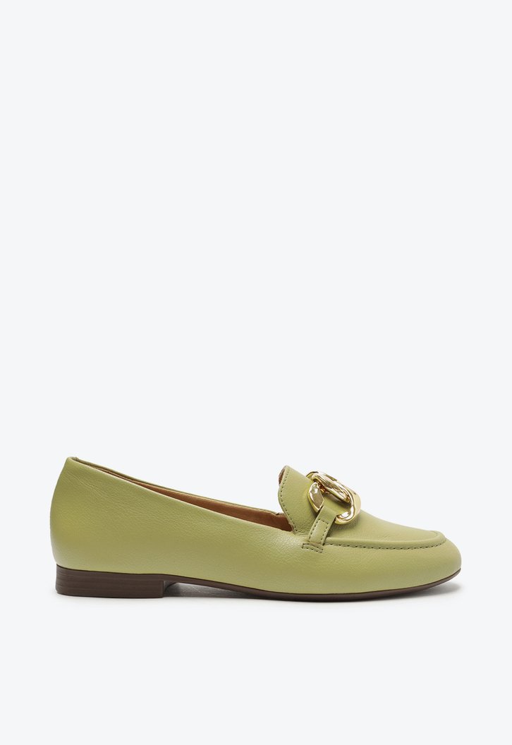 Mocassim Anacapri verde. O modelo clássico vem para a temporada totalmente repaginado: com shape moderno, robusto e minimalista, possui solado emborrachado com pequeno saltinho. Fechado, de biqueira arredondada, apresenta cabedal em recorte lateral na gáspea e detalhe em tira com aplicação de maxi corrente metálica dourada. Traz palmilha confortável acolchoada em nude e assinatura Anacapri.
