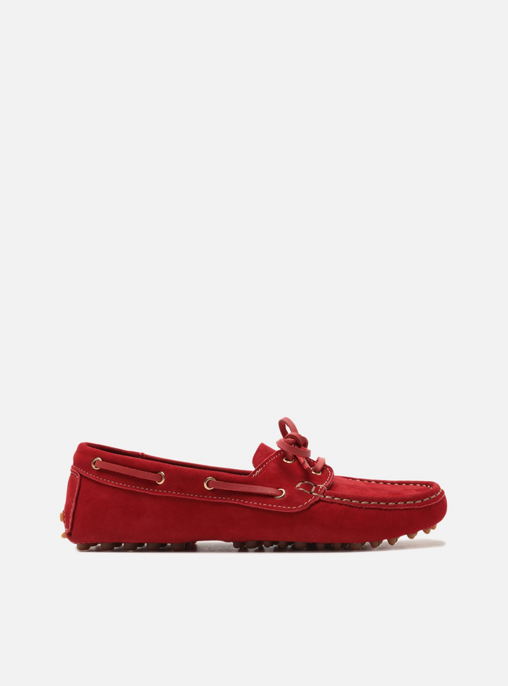 Mocassim feminino vermelho em camurça. O sapato tem salto rasteiro e formato arredondado na ponta, além de sola emborrachada com travas. Fechado, traz recorte lateral na gáspea e aplicação de tira transpassada no contorno superior que fecha em laço sobre o cabedal. Possui costura em pesponto no contorno da biqueira e sobreposição no calcanhar. Exibe toda a parte superior do pé.