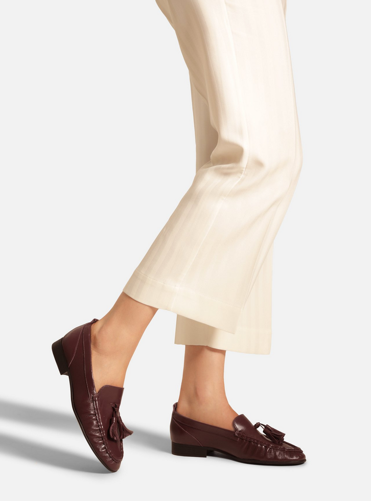 Mocassim feminino vinho de couro. O sapato tem salto mínimo bloco e formato arredondado na ponta. Fechado, traz recorte lateral na gáspea e aplicação de par de barbicachos sobre o cabedal. Possui costura marcada no contorno da parte frontal e pregas. Com tira no calcanhar, exibe toda a parte superior do pé.