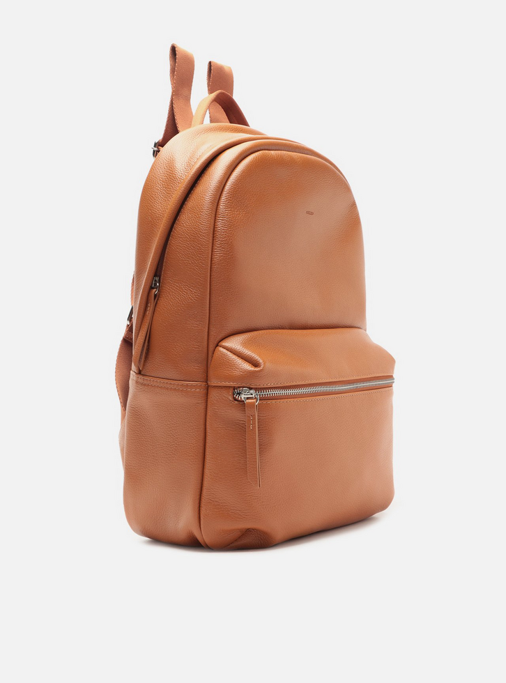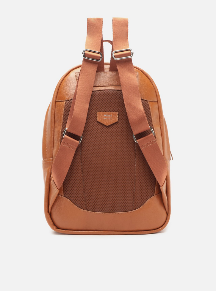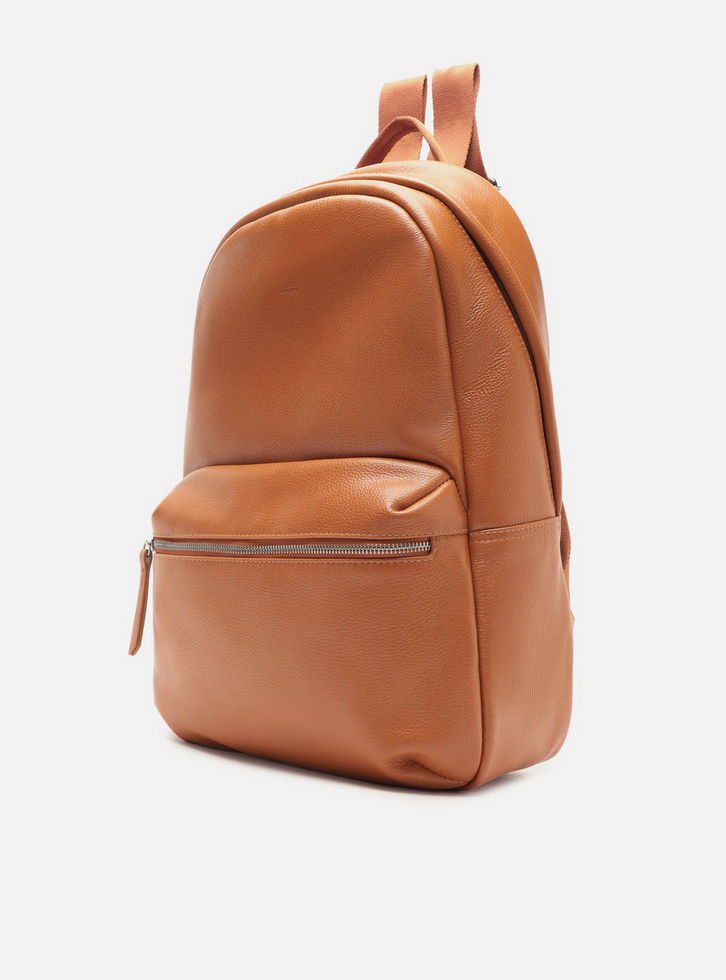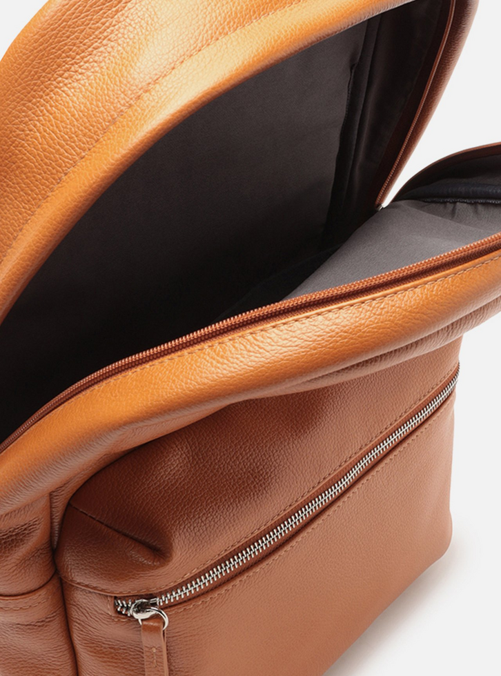 Mochila grande marrom de couro. O acessório tem formato estruturado e acabamento liso. Traz alças de ombro reguláveis em gorgorão e alça de mão superior. Possui bolso frontal externo com fecho em zíper e bolso interno para notebook, além de fecho superior em zíper com puxador. Com forro em tecido bege.