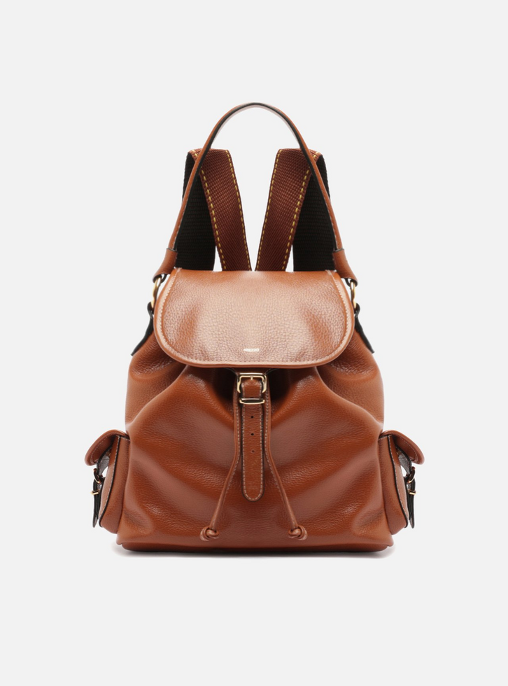 Mochila média marrom de couro. O acessório tem formato estruturado, acabamento texturizado e detalhe em pesponto nas bordas. Possui alças de ombro reguláveis em gorgorão e alça de mão superior alongada. O fechamento é em enforcador sob tampo frontal com fecho em tira e fivela. Traz ainda bolsos externos laterais, também com fechamento em tiras e fivelas, além de forro em tecido e bolso interno.
