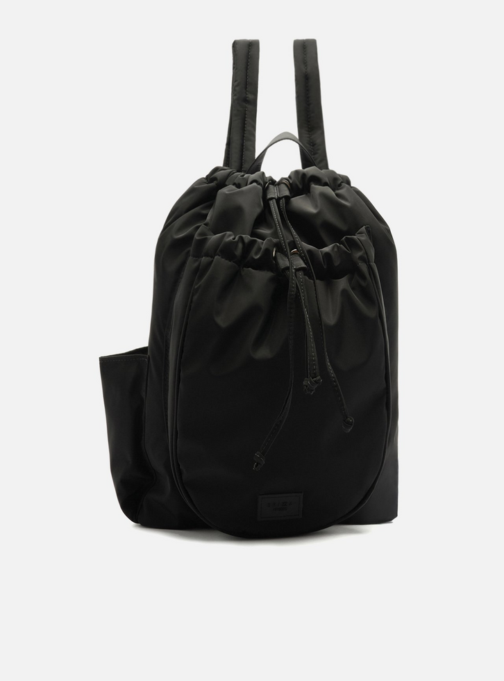 Mochila média preta em nylon. O acessório tem formato estruturado e acabamento macio. Possui alça de mão e duas alças acolchoadas na parte de trás. Traz fecho superior em enforcador, bolso frontal porta-raquete e bolso lateral porta-garrafa. Com tag emborrachada do nome da marca na capa.