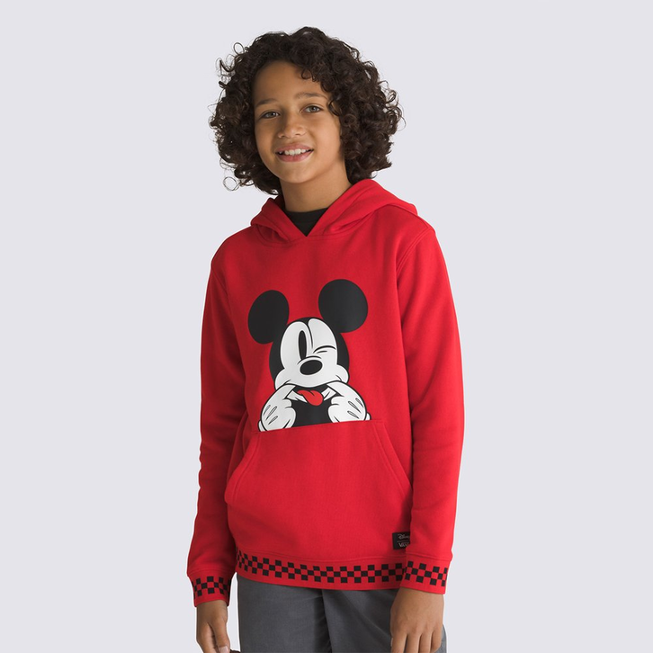 Entrando no mundo da Disney com a essência “Off The Wall”, o Moletom Funhouse 100 Po Infantil Disney Racing Red traz a estampa frontal divertida do ratinho mais amado da Disney - o Mickey Mouse - fazendo careta e mostrando a língua, com detalhes em checkerboard icônico Vans nos punhos e na barra. Confeccionado em tecido de algodão e poliéster, o moletom infantil na cor vermelha possui capuz e bolsos frontais estilo canguru. Traz aplicação de etiqueta tecida com assinatura da coleção Disney X Vans aplicada na parte frontal. Com a essência da Vans, um moletom aconchegante para que os pequenos celebrem a magia atemporal da Disney todos os dias. Para simplesmente brincar e se divertir!