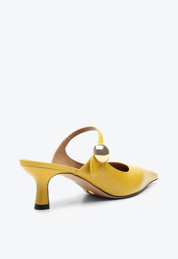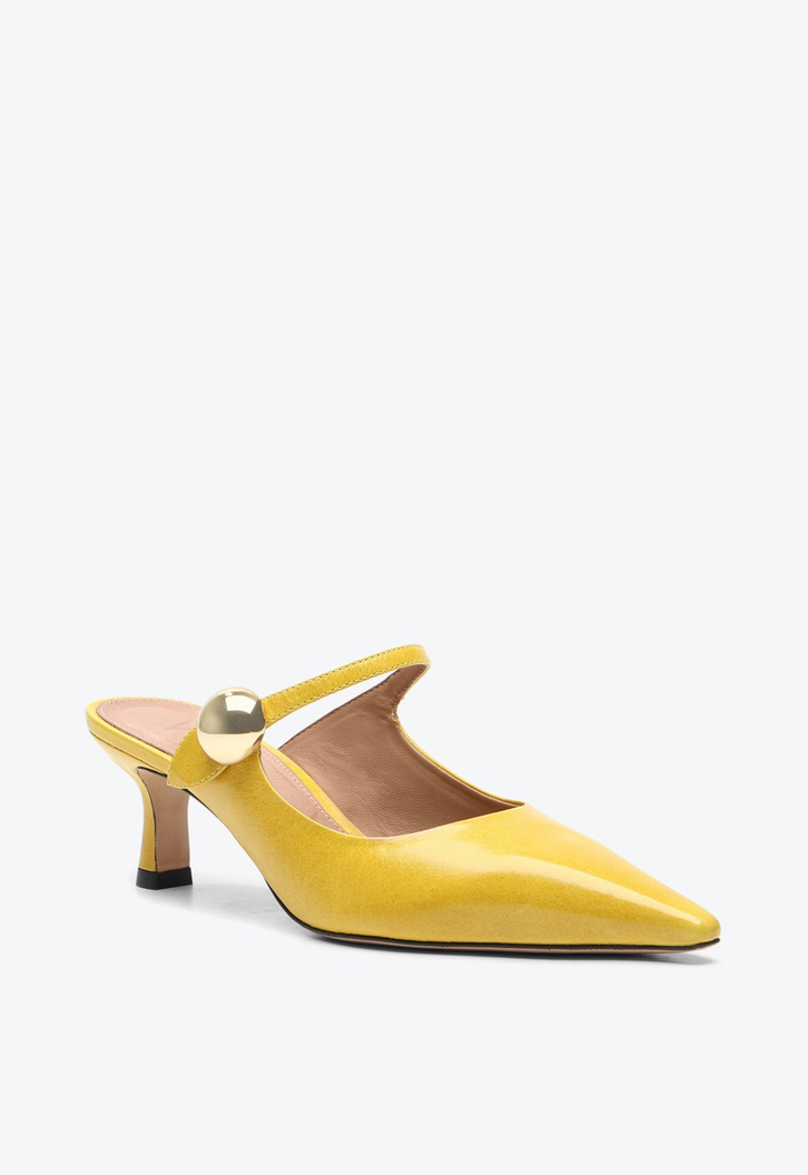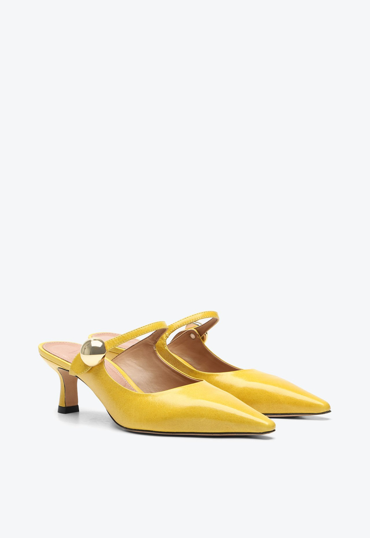 Mule com salto médio em couro amarelo. Com uma construção atemporal, garante elegância e atemporalidade. Ela é uma verdadeira clássica repaginada! Traz uma cartela de cores fresh, perfeita para o verão.