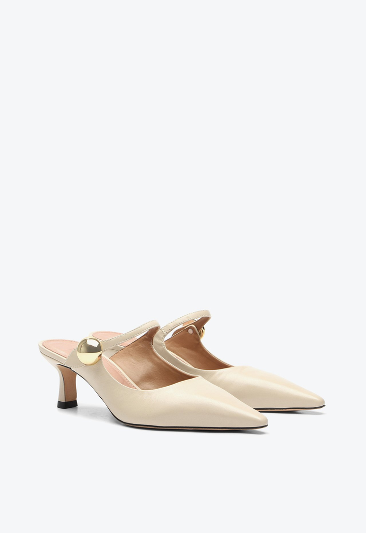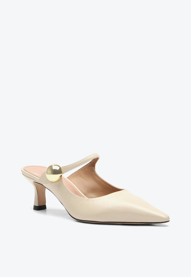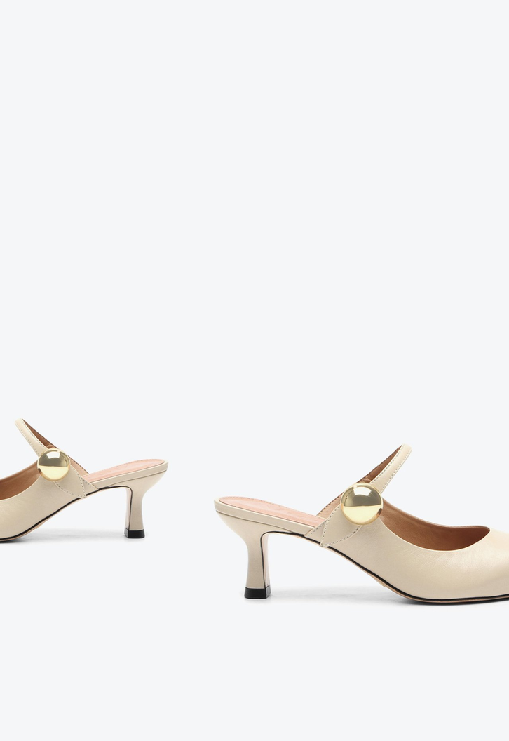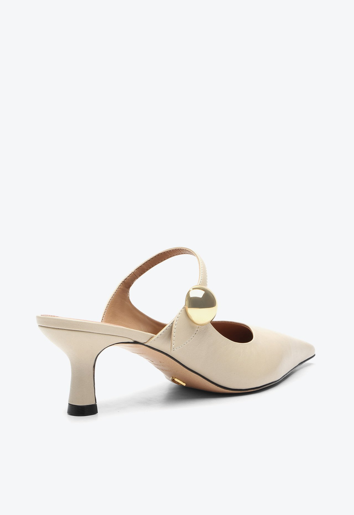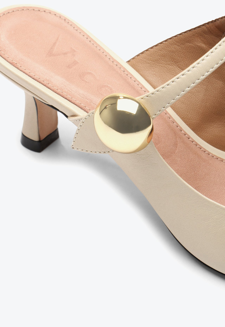 Mule com salto médio em couro bege. Com uma construção atemporal, garante elegância e atemporalidade. Ela é uma verdadeira clássica repaginada! Traz uma cartela de cores fresh, perfeita para o verão.