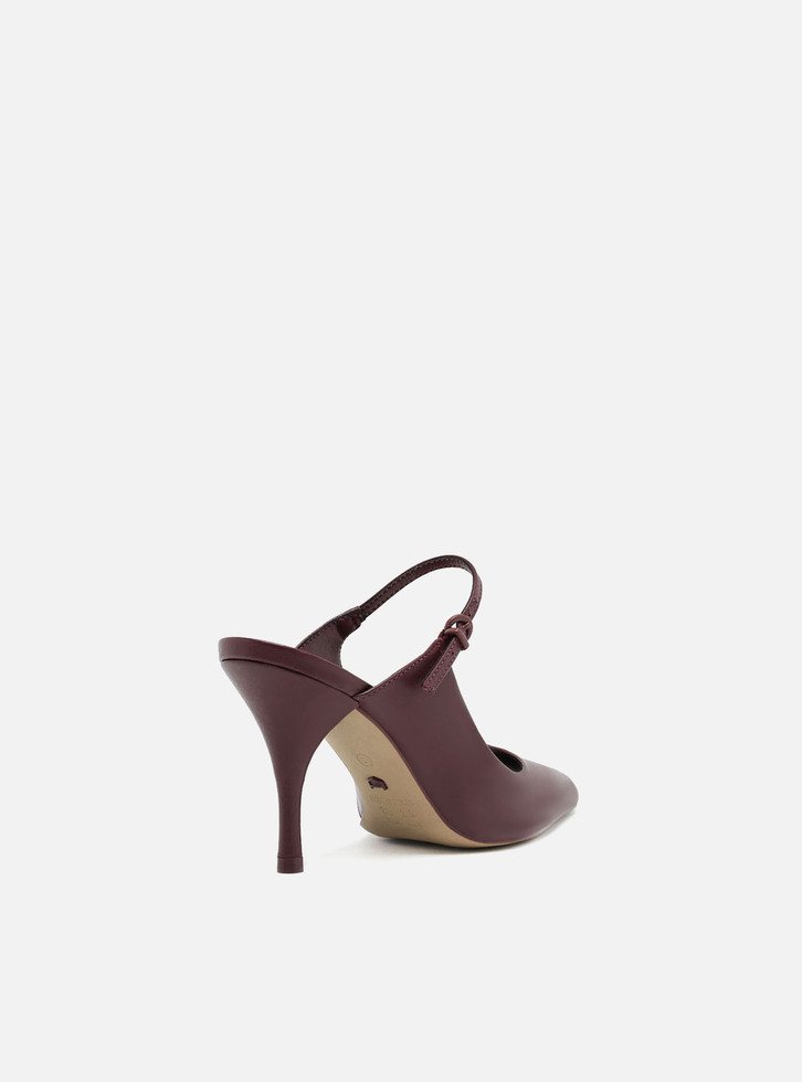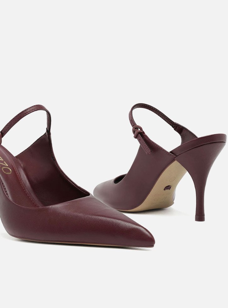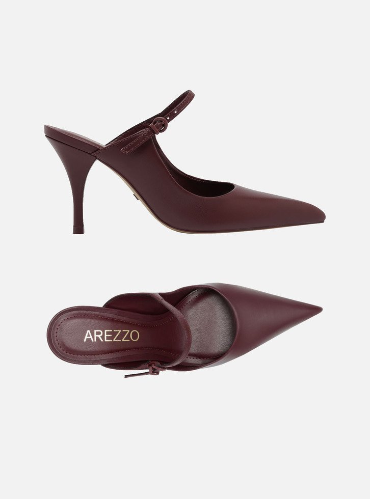 Mule feminina bordô em cetim. O sapato tem salto médio fino e ponta fina. Fechada, tem recorte arredondado no cabedal e tira fina afivelada na parte superior do pé. Com palmilha da cor da mule e inscrição do nome da marca.