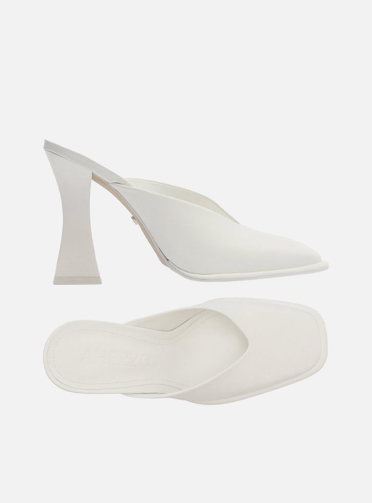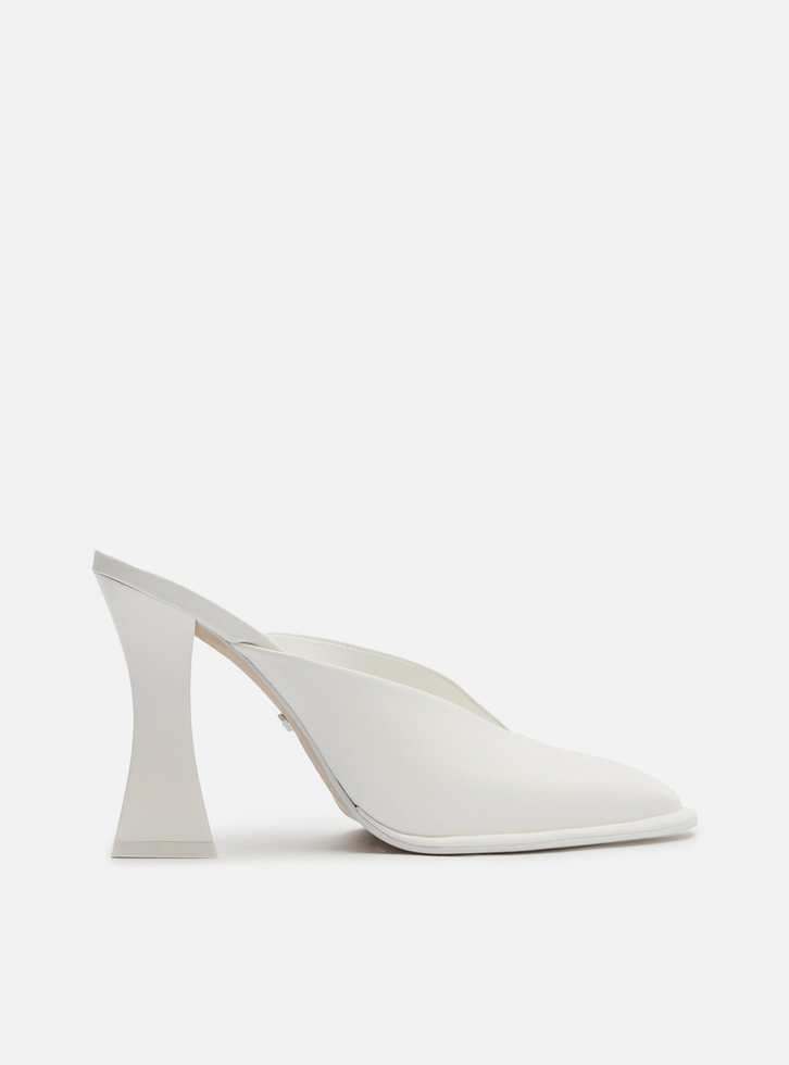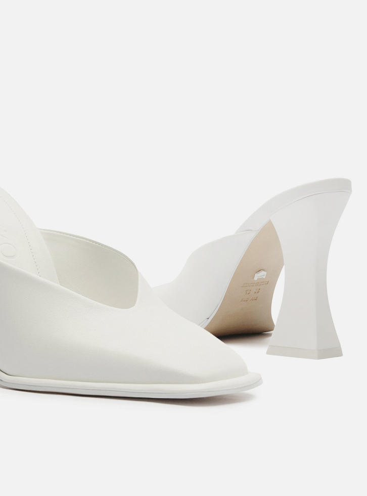 Mule feminina branca em couro. O sapato tem salto alto flare e formato arredondado na ponta. Fechada, tem recorte em V na parte superior do pé. Com palmilha da cor da mule e inscrição do nome da marca.