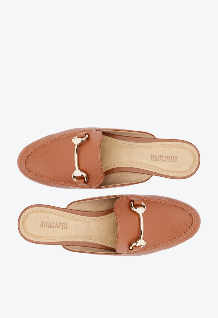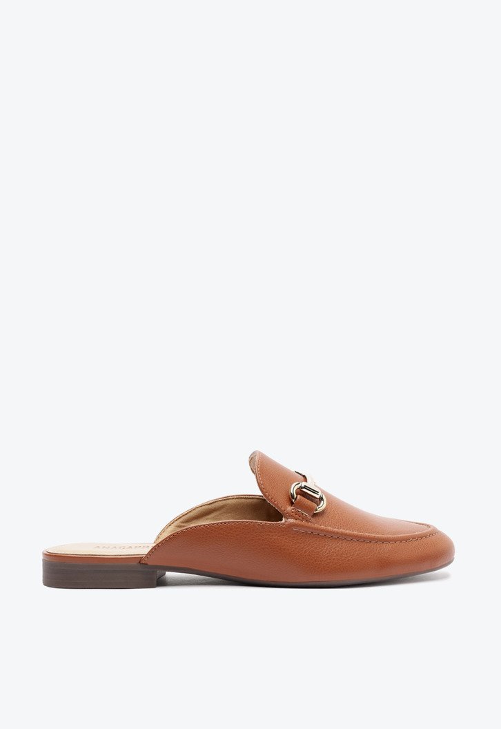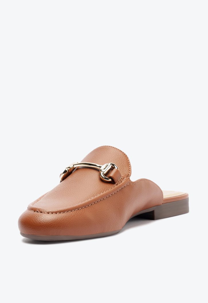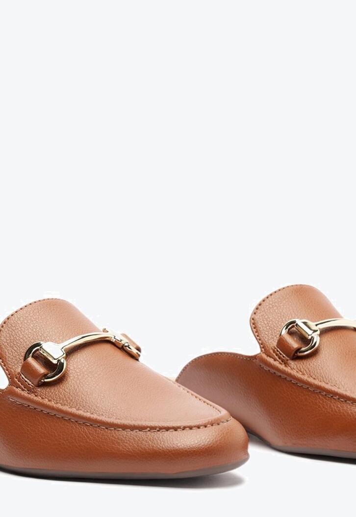 Mule Bridão Essencial Marrom. Possui bico arredondado e aplicação de bridão metálico na gáspea. Palmilha nude com o nome da marca. Deixa calcanhar à mostra.