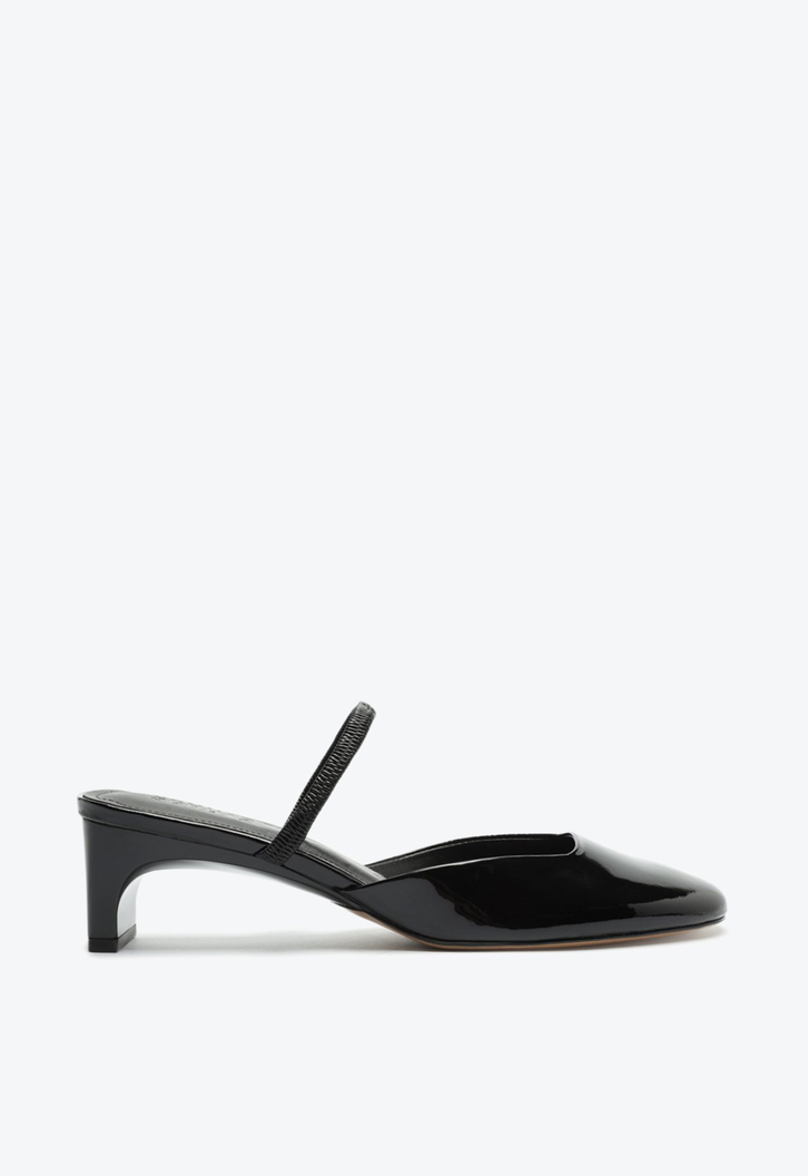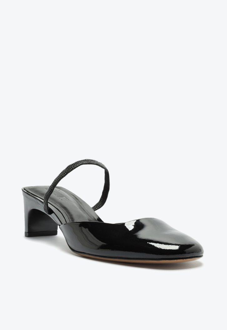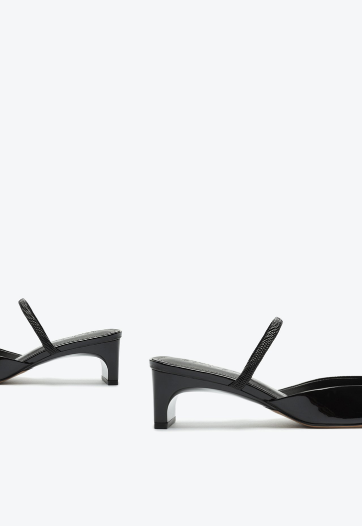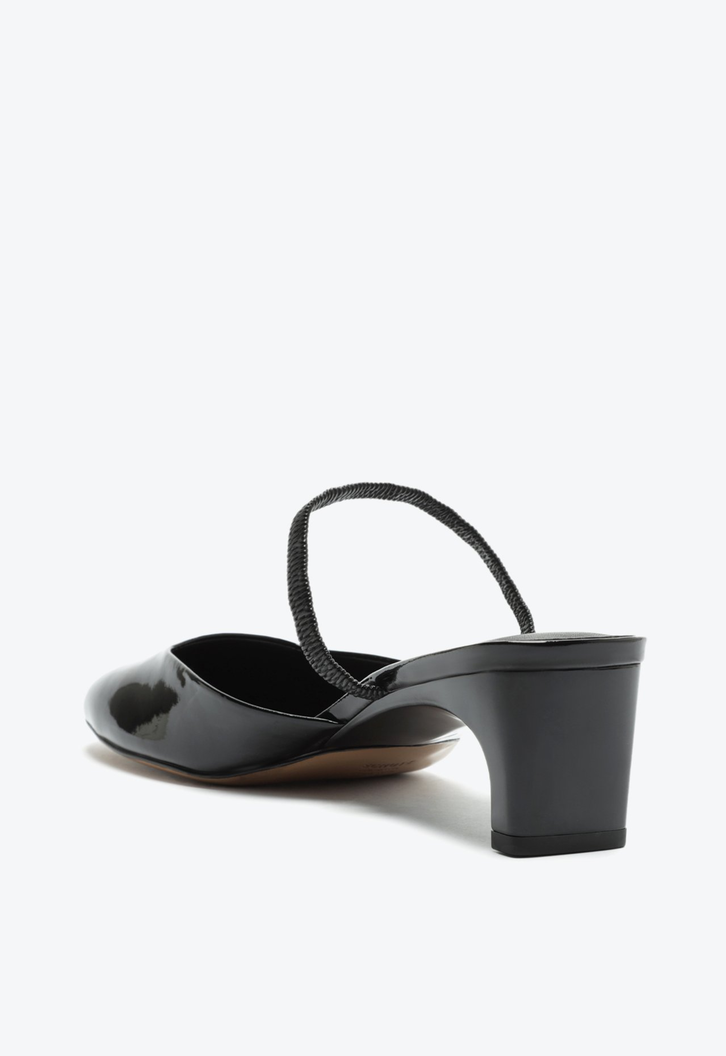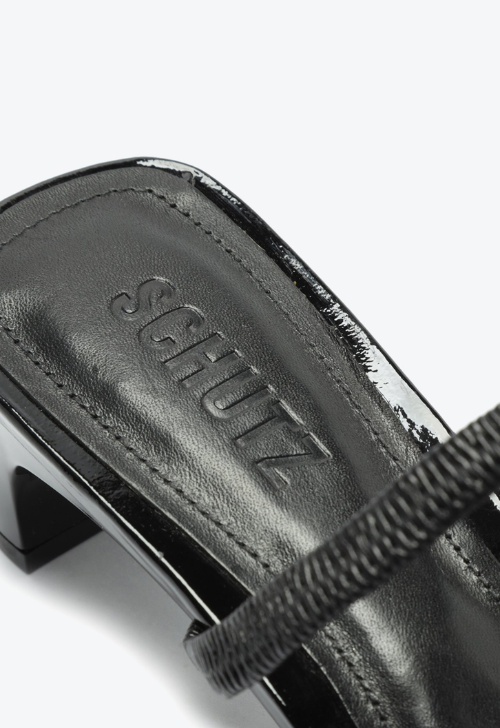 O bico arredondado com a cava quadrada deixa o elegante sapato mule preto mais moderno. Trazendo o conforto do salto midi barra (kitten heel) e o visual sexy do verniz, vai ser uma aposta certeira para todas as horas!