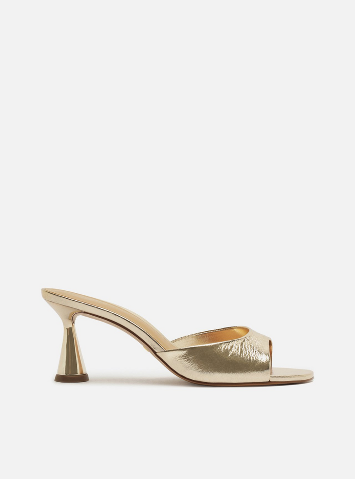 Mule metalizada dourada. Possui salto taça, bico arredondado, recorte frontal aberto. Com palmilha marrom e inscrição do nome da marca.