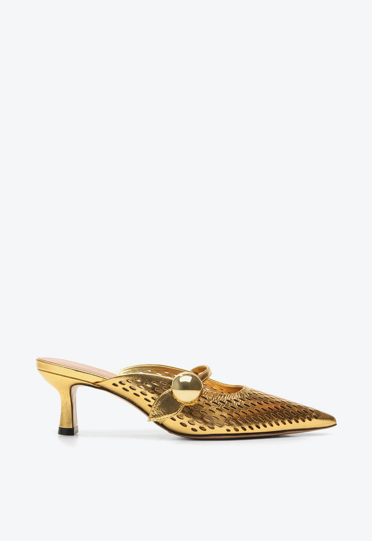 Mule de salto médio em dourado com detalhe metalizado. A textura ganha destaque neste modelo que une sofisticação e conforto. A escolha perfeita para composições modernas com um toque retrô. Aposte nessa estética versátil nos looks de inverno!