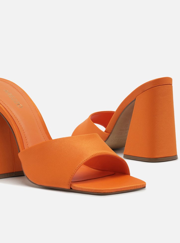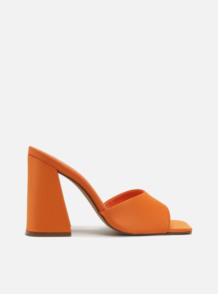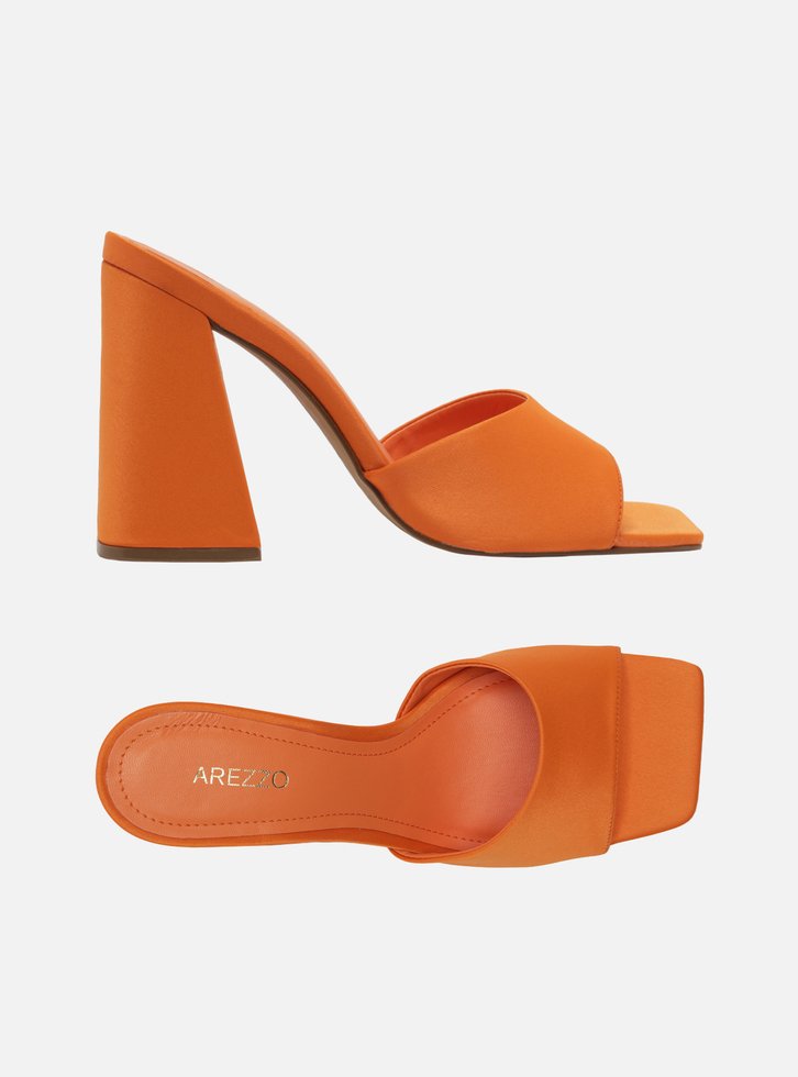 Mule laranja em cetim. O modelo tem salto alto bloco, flare e bico quadrado. Traz tira larga e única no cabedal, que cobre parte do peito do pé. Aberta, exibe dedos, peito do pé e calcanhar. Com palmilha da cor da sandália e incrição do nome da marca.