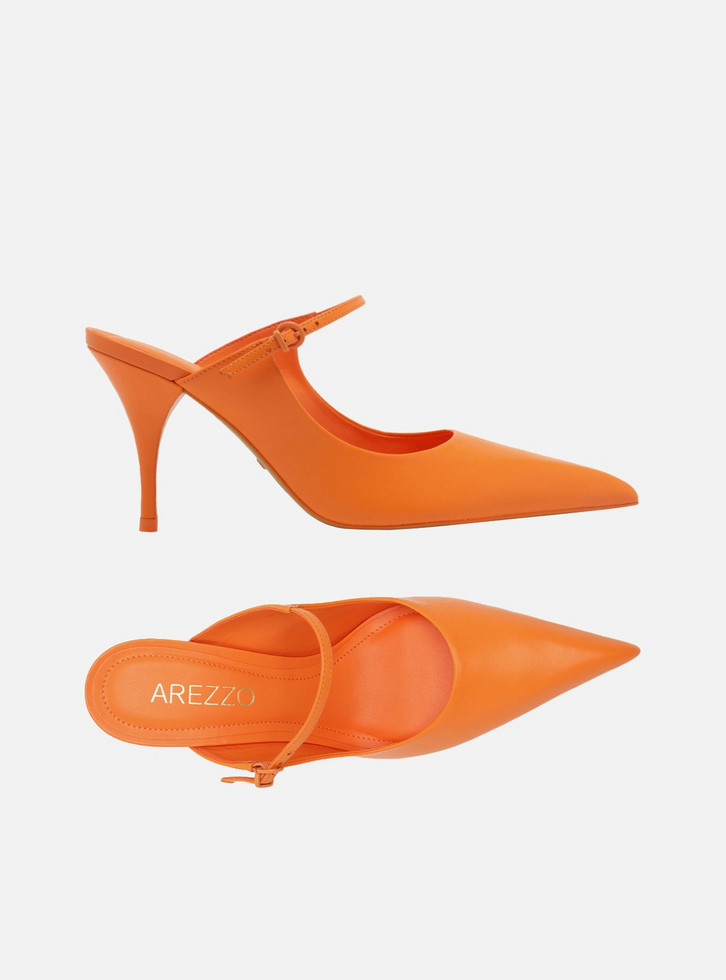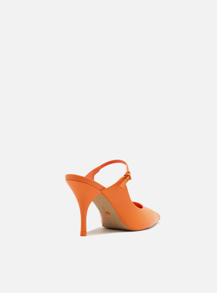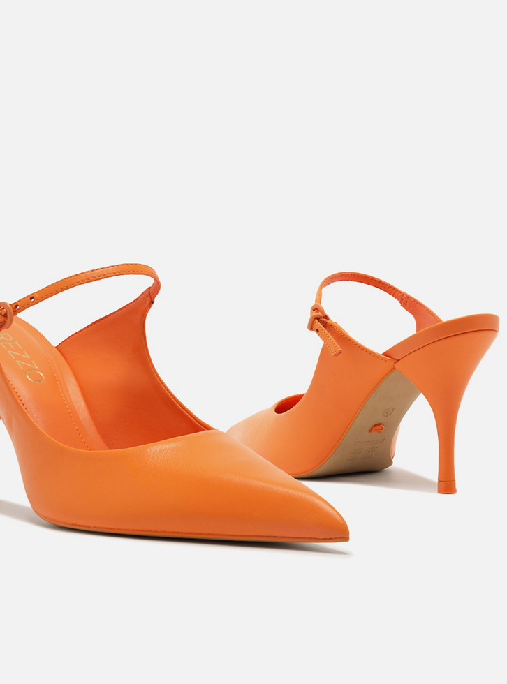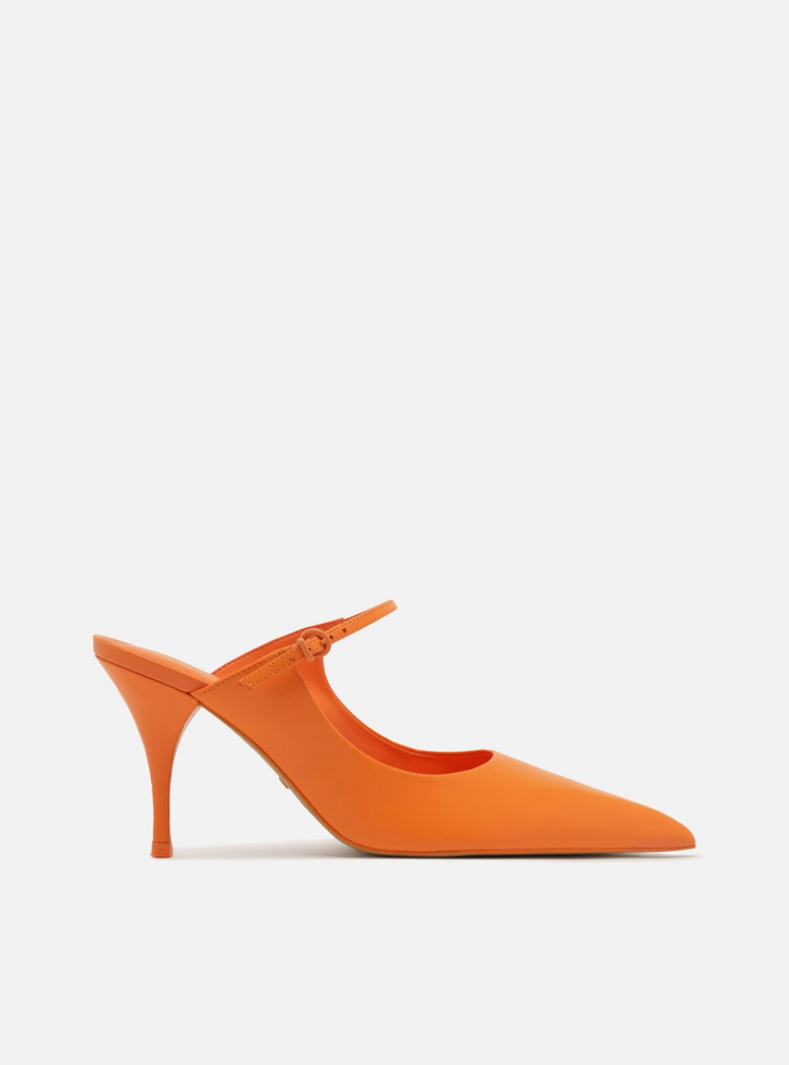 Mule feminina laranja em couro. O sapato tem salto médio fino e ponta fina. Fechada, tem recorte arredondado no cabedal e tira fina afivelada na parte superior do pé. Com palmilha da cor da mule e inscrição do nome da marca.
