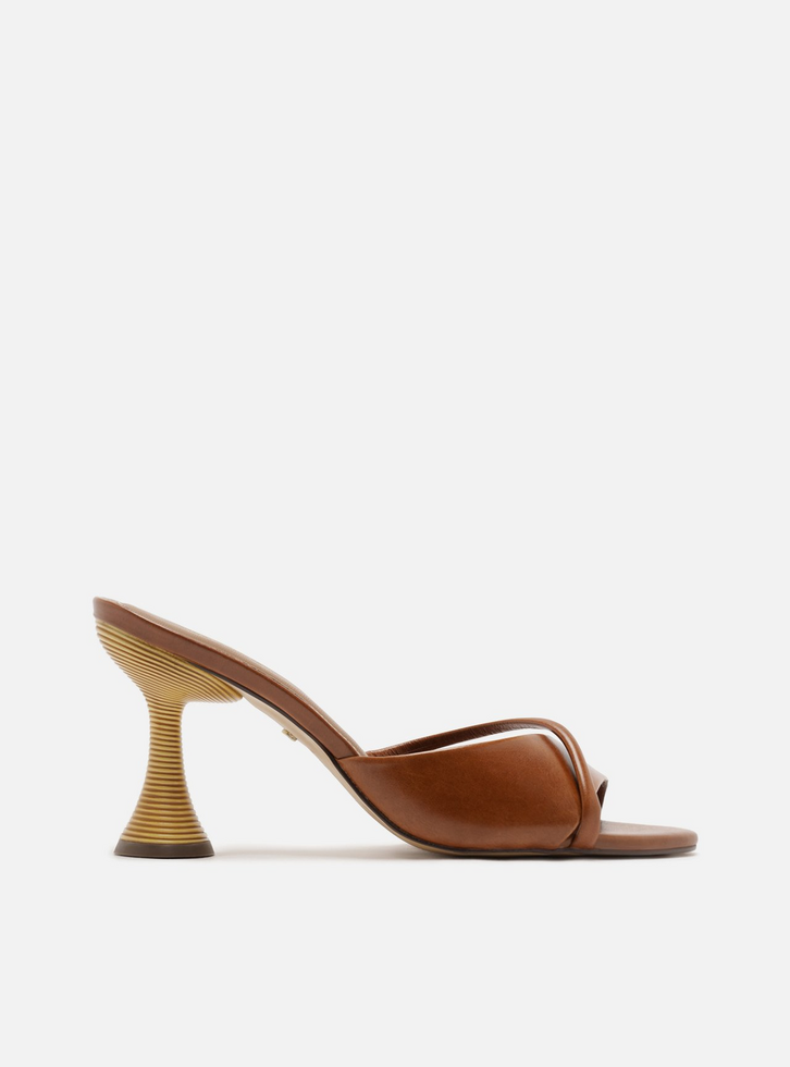 Sandália feminina marrom em couro. O sapato tem salto médio geométrico em formato taça, revestido em material com efeito listrado, e formato arredondado na ponta. Possui tira larga sobre os dedos e tira fina sobreposta, cruzada na diagonal. Com palmilha marrom e inscrição do nome da marca.