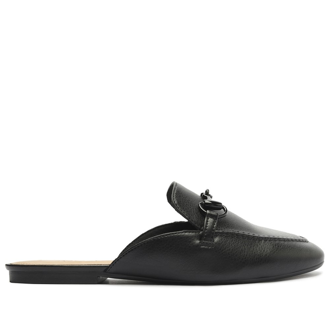 Mule preta feminina em material similiar ao couro. Posui bico levemente quadrado e aplicação de bridão na gáspea na mesma cor do modelo. Palmilha nude com o nome da marca. Deixa calcanhar à mostra.